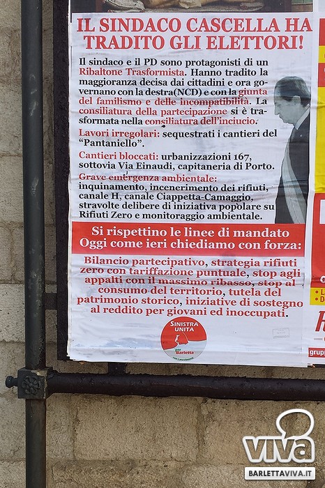 Nella serata di ieri, però, è stato diramato un comunicato a firma dei consiglieri Pietro Sciusco, Anna Rizzi Francabandiera (già vicesindaco di Cascella nella scorsa giunta) e Michele Lasala, assessore di riferimento di Sinistra Unita, che prendono le distanze da questa iniziativa. «Con il presente comunicato i sottoscritti doverosamente intervengono per rimarcare la netta distanza con quella parte della lista di Sinistra Unita per Barletta che si è resa protagonista, ancora una volta, di una iniziativa del tutto personale e soggettiva, seppur utilizzando il simbolo della lista e facendola passare dunque come una volontà unanime e unitaria della rappresentanza della Lista stessa. Cosa che invece così non è. Infatti, si ribadisce e si denuncia l'utilizzo abusivo del simbolo e della lista che viene ormai da tempo perpetrato ad opera di alcuni soggetti al solo fine di accreditarsi posizioni, giudizi e velleità del tutto personali, come fossero legittimate da una forza politica, che già da tempo li ha disconosciuti. Pertanto, come suddetto si rende necessario comunicare e ribadire che il manifesto apparso in data odierna non è attribuibile alla lista di Sinistra-Unita per Barletta ma ha evidentemente tutt'altra paternità.