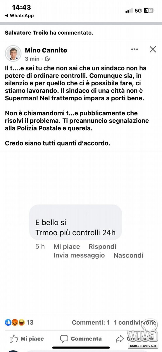 Una richiesta di controlli un po' troppo colorita e la risposta a tono del sindaco Cosimo Cannito, ancora protagonista sui social. Dopo la denuncia di inizio mese verso chi lo aveva definito "fannullone", il primo cittadino si è scagliato contro un utente che lo ha apostrofato con il classico epiteto utilizzato dai pugliesi per indicare l'auto erotismo e l'essere "tonti".