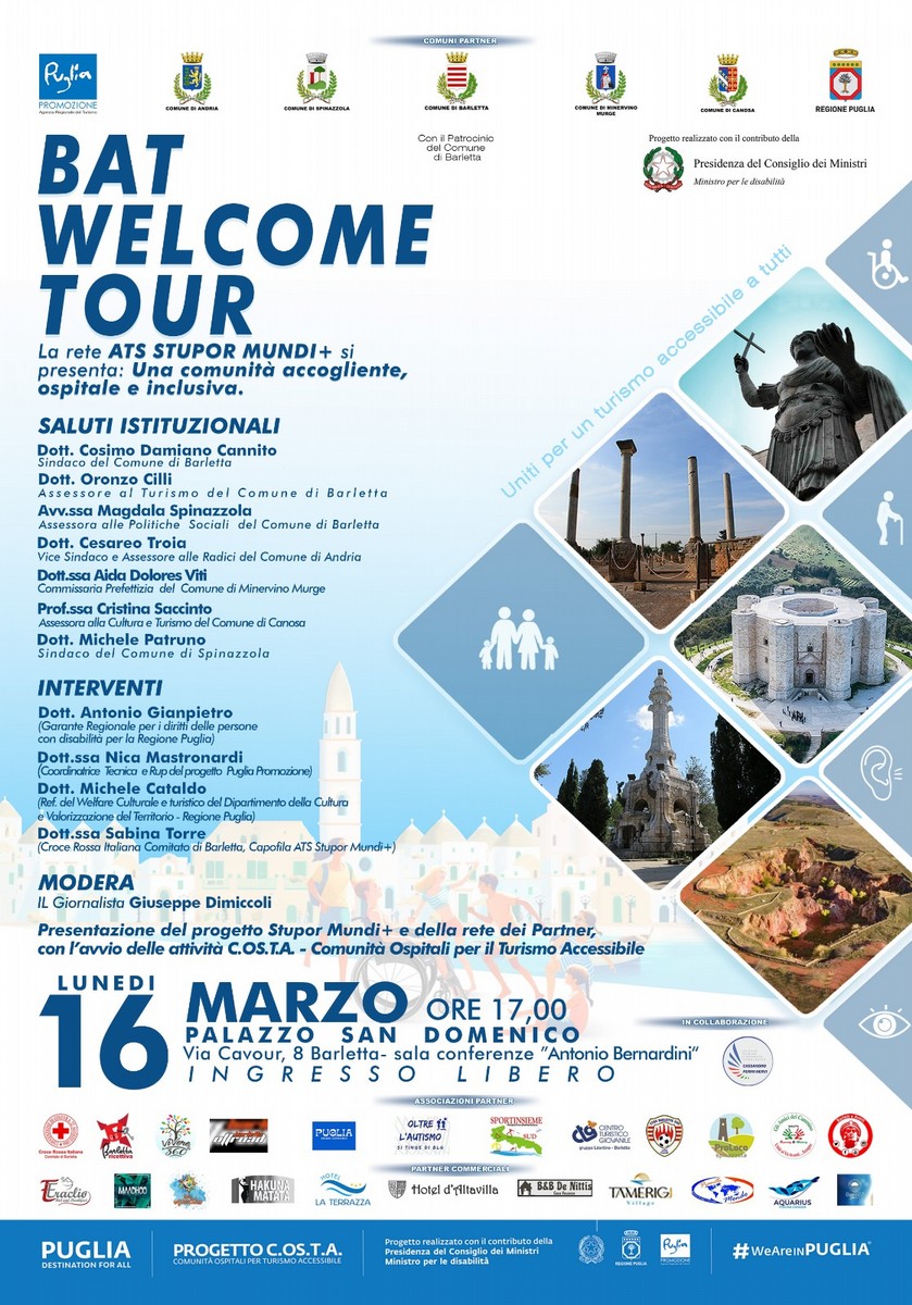 Andria, Spinazzola, Minervino Murge e Canosa, insieme a numerose associazioni e partner del territorio. Il BAT Welcome Tour rappresenta quindi un primo passo concreto verso la costruzione di un territorio sempre più accogliente, accessibile e inclusivo, capace di offrire esperienze turistiche di qualità a tutti.