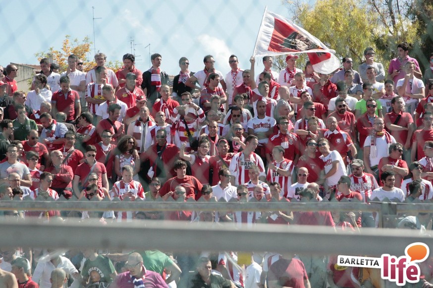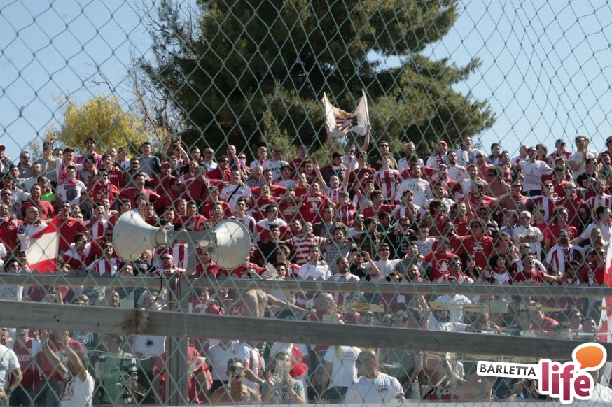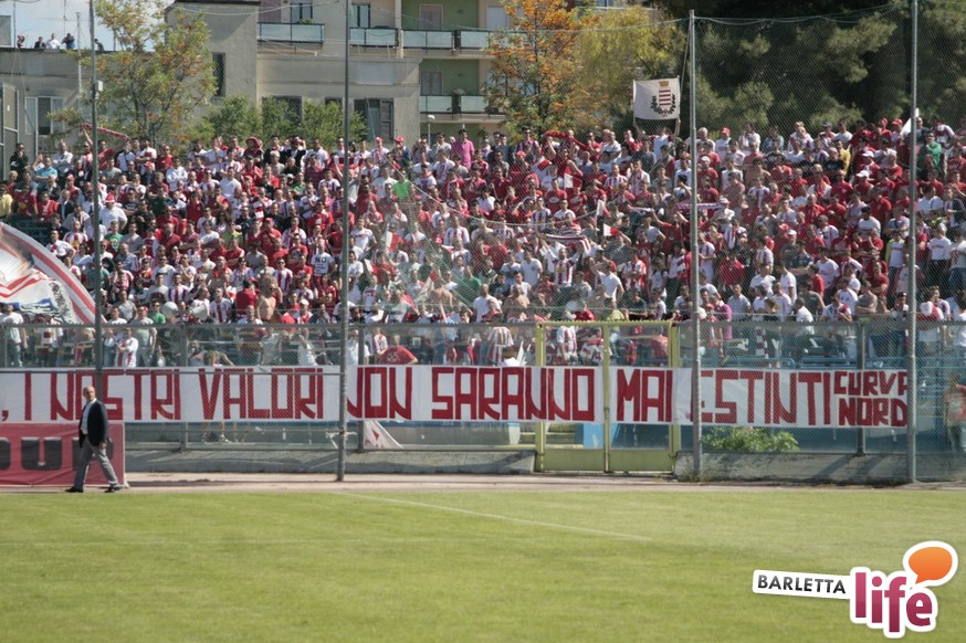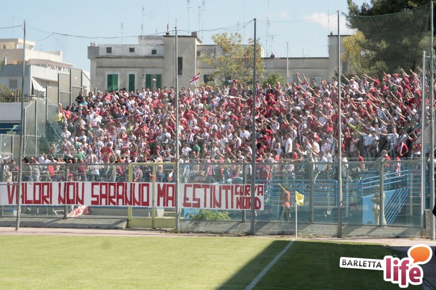 Barletta-Andria resta sempre il derby della Bat, all'insegna di sani sfottò e una verace rivalità. Passano i calciatori, i risultati, talvolta anche le categorie di disputa dei rispettivi campionati, ma qualcosa che non cambia mai, immarcescibile almeno per i gruppi più caldi dei rispettivi "gruppi organizzati" del tifo, è lo stretto gemellaggio tra biancorossi e biancoazzurri. "Vincitori o vinti, i nostri valori non saranno mai estinti" e "Fino alla fine, Andria e Barletta" sono stati i principali leit-motiv della giornata, in particolare nel pre-partita, tra gli "aficionados" facenti parte dei 4000 sugli spalti. Striscioni paralleli, animi diversi durante la partita: caldo il tifo andriese, che prima si "lancia" con dei cori la sua presenza in Curva Nord a prescindere dalla categoria, per poi passare ai lanci, questi censurabili, di petardi e fumogeni all'indirizzo del portiere Rossi, inducendo Chiffi alla sospensione di otto minuti.