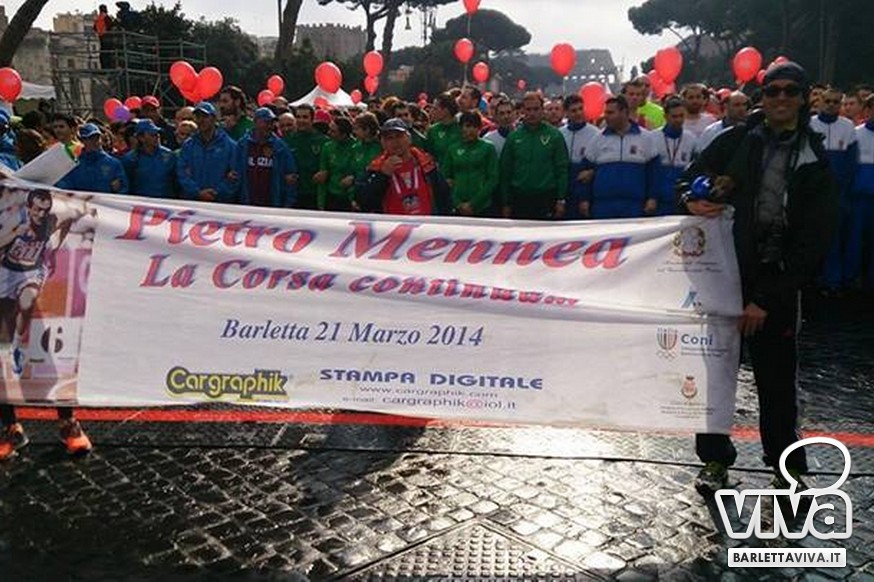 Nella Capitale più di 100 atleti con la maglia arancio alla 20^ Maratona di Roma che oltre a gareggiare hanno voluto omaggiare il ricordo del nostro campione barlettano Pietro Mennea, con striscioni vari e con una insolita iniziativa; dodici atlete (Mariella Dileo, Angela Gargano, Raffaella Distasio, Grazia Bizzoca, Michela Lionetti, Mary Moccia, Cinzia Lattanzio, Teresa Piccolo, Annamaria Persia, Lucia Chisari, Arcangela Lacerenza e Giuseppina Fiorella) hanno gareggiato con impressa sulla loro maglia una lettera che con la loro unione formavano il nome del campione mondiale. Tra gli atleti in gara anche Eligio Lomuscio, che ha fatto en-plein della competizione capitolina ed è annoverato tra i 48 Senatori della Maratona di Roma: i primati maschile e femminile sono andati rispettivamente a Massimiliano Defazio (3 ore, 6 minuti e 3 secondi) e Teresa Lelario (3 ore, 17 minuti e 8 secondi). Un bel traguardo nella giornata del primato italiano ed europeo del barlettano Mimmo Ricatti.