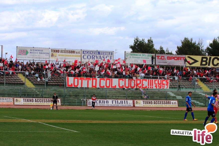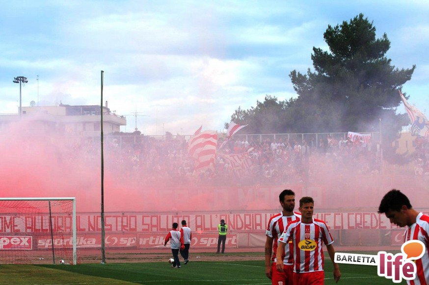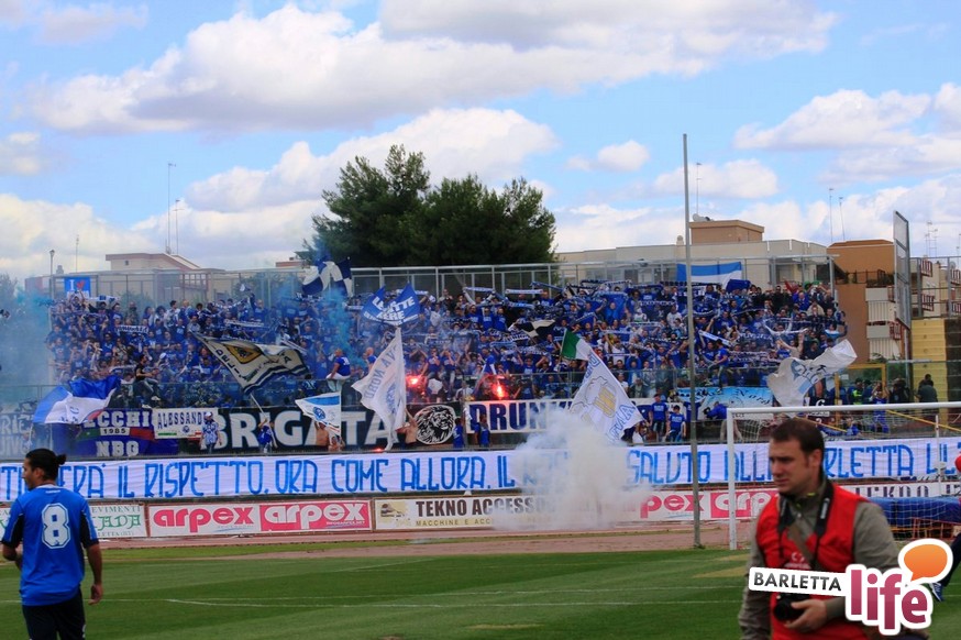 Al di là del risultato, dell'enorme posta in palio e delle tensioni sportive: Barletta-Andria resta sempre il derby della Bat, all'insegna di sani sfottò e una verace rivalità. Passano i calciatori, i risultati, talvolta anche le categorie di disputa dei rispettivi campionati, ma qualcosa che non cambia mai, immarcescibile almeno per i gruppi più caldi dei rispettivi "gruppi organizzati" del tifo, è lo stretto gemellaggio tra biancorossi e biancoazzurri. Indubbio valore aggiunto a uno sport che ormai lascia sempre meno spazio alle emozioni, all'amicizia, in nome della sfrenata ricerca del risultato a tutti i costi. Ieri le due tifoserie hanno messo, almeno in avvio di gara, in secondo piano le complesse situazioni di classifica in cui versano i loro beniamini e la ragion di campo,dando vita a uno spettacolo che sugli spalti ha confermato la fratellanza calcistica tra le due piazze: "Ora come allora, il nostro saluto all'Andria" e Ora come allora, il nostro saluto al Barletta", come i due striscioni esposti sulle rispettive curve recitavano. "Rispetto", "Unione" e "Amicizia" le parole chiave del pre-partita, che ha visto le due curve colorate di biancorosso e biancoazzurro, a dar vita a due uniche onde di genuina passione.