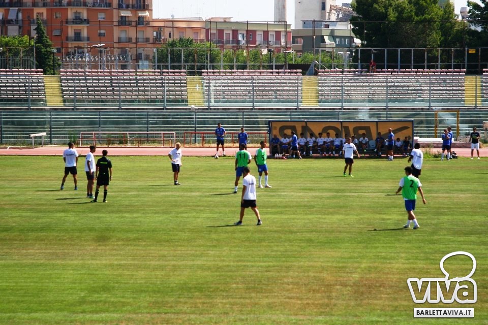 Avendo già disputato ieri un test in famiglia, mister Sesia lascia a riposo buona parte dei giovani a sua disposizione, schierando un 4-3-3 con Liverani in porta, Cortellini, Radi, Stendardo e Regno in difesa, Branzani, Quadri e Mantovani in mediana e il tridente composto da Floriano, Fall e Venitucci. Pronti a subentrare nella ripresa Rizzitelli e Matera e il nuovo acquisto Biancolino. Di fronte, mister Costantino schiera il suo miglior Trani, che, soprattutto nella prima frazione, da filo da torcere agli avversari. Dopo le prime fasi di studio, a sbloccare il risultato è Cortellini. Il terzino sinistro risolve in mischia sorprendendo Sansonna, dopo che il Barletta si era già reso pericoloso con Fall e Floriano. La Vigor Trani non rinuncia a fare gioco, e prova a pungere il Barletta con ripartenze veloci che fanno soffrire l'esperta retroguardia biancorossa, soprattutto Stendardo apparso in ritardo di condizione. Il Barletta, però, mantiene le chiavi del centrocampo e si fa vedere spesso in avanti, soprattutto grazie ad un Floriano molto ispirato. Al 37' è l'ex Andria Albrizio a sorprendere la retroguardia avversaria. Dopo aver saltato Stendardo, il centrocampista deposita la sfera alle spalle di un incolpevole Liverani. Il primo tempo termina con il risultato di 1-1. Nell'intervallo, mister Costantino manda in campo una formazione totalmente rinnovata, mentre Sesia sostituisce soltanto Liverani per De Martino.