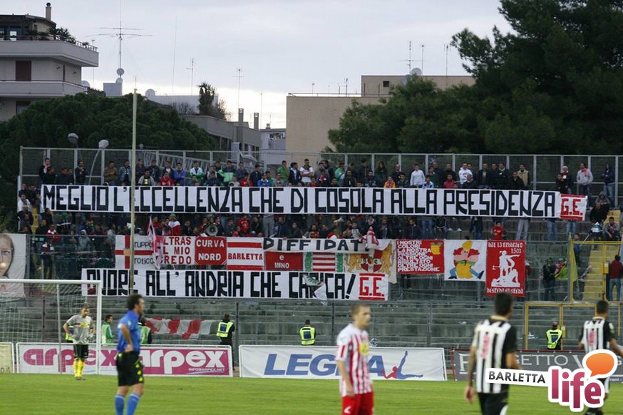 Metà del secondo tempo di Barletta-Viareggio, partita giocata sabato pomeriggio per il turno numero 12 del campionato di Prima Divisione Lega Pro, girone B. Con il punteggio già sullo 0-2 in favore dei toscani, avanti sui biancorossi, ingrigiti nelle giocate e nell'animo per l'occasione: nel silenzio del "Puttilli" spunta uno striscione in Curva Nord, cuore del tifo biancorosso. "Meglio l'eccellenza che Di Cosola in dirigenza": chiaro il riferimento a Pasquale Di Cosola, imprenditore barlettano 43enne figlio del più noto Francesco che tra gli anni '80 e l'alba degli anni '90 ha detenuto la presidenza della S.S. Barletta Calcio, che in tempi recenti aveva rivelato il suo interesse per il sodalizio di via Vittorio Veneto.