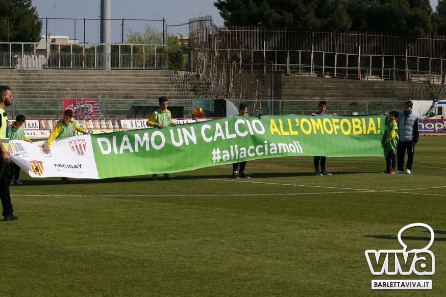 Al festoso fischio d'inizio, con le squadre scese in campo accomunate dallo striscione "Diamo un calcio all'omofobia! Allacciamoli", ha fatto da contrapposizione la stridente differenza tecnico-tattica tra i 22 in campo. Il ko finale è maturato al termine di una delle peggiori prestazioni della storia recente del team di Orlandi, subissato di fischi al pari degli altri componenti dello staff biancorosso a fine gara. Così i cori di incitamento lentamente sugli spalti hanno lasciato spazio ai fischi, alle urla di disappunto- qualcuna anche oltre i toni della civiltà- e allo sdegno di molti degli astanti: quella che doveva essere una giornata di festa si è presto trasformata in una data da segnare in grigio carbone sul calendario e nei cuori degli appassionati del Barletta Calcio.