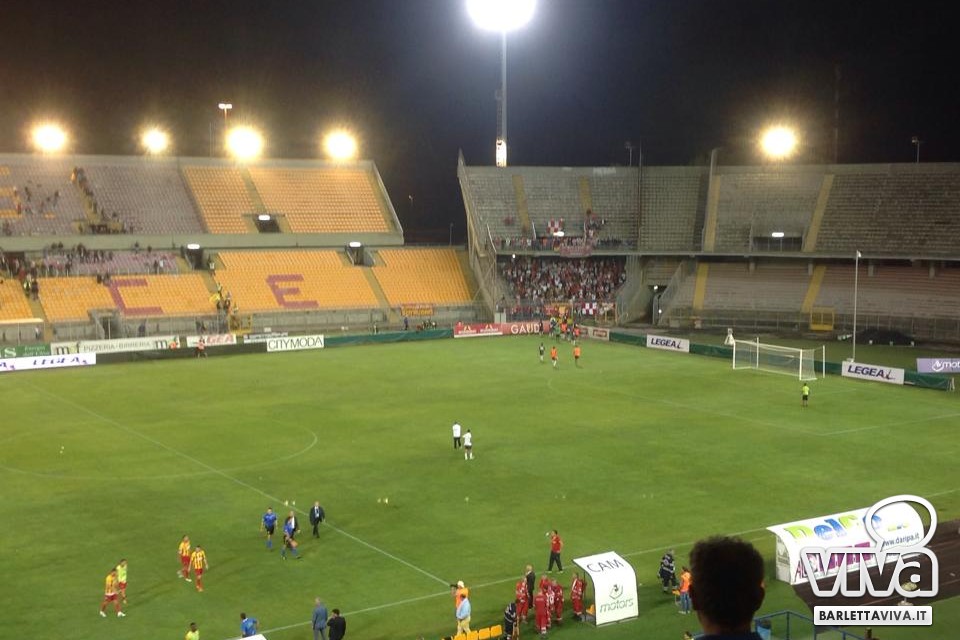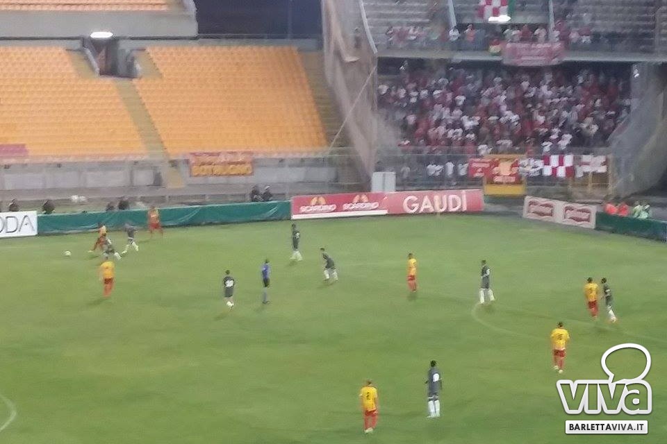 Avvio vibrante da entrambe le parti: il Barletta prova a pungere verticalizzando su Fall, mentre nel Lecce è Doumbia ad infiammare la manovra con un paio di traversoni smorzati da Radi prima e da Liverani poi. Al 7' pasticcio sull'asse Lopez-Abruzzese, Venitucci anticipa Caglioni ma nel controllo spedisce sul fondo. La pressione della partita si sposta nella metà campo barlettana, ma eccezion fatta per una sortita di Moscardelli stoppata da Radi e uno stacco del numero 10 giallorosso stoppato da Liverani, non si registrano pericoli nei primi 15 minuti. Al 16' si esalta Liverani: Cortellini pasticcia a sinistra, Carrozza entra in area e pennella sul secondo palo, dove arriva Doumbia che con il destro mira l'angolino, trovando la splendida risposta del numero 1 ospite. Il pericolo scuote il Barletta, che risponde con una ripartenza di Floriano e un cross di Legras sul quale Abruzzese anticipa Fall pronto al tap-in.