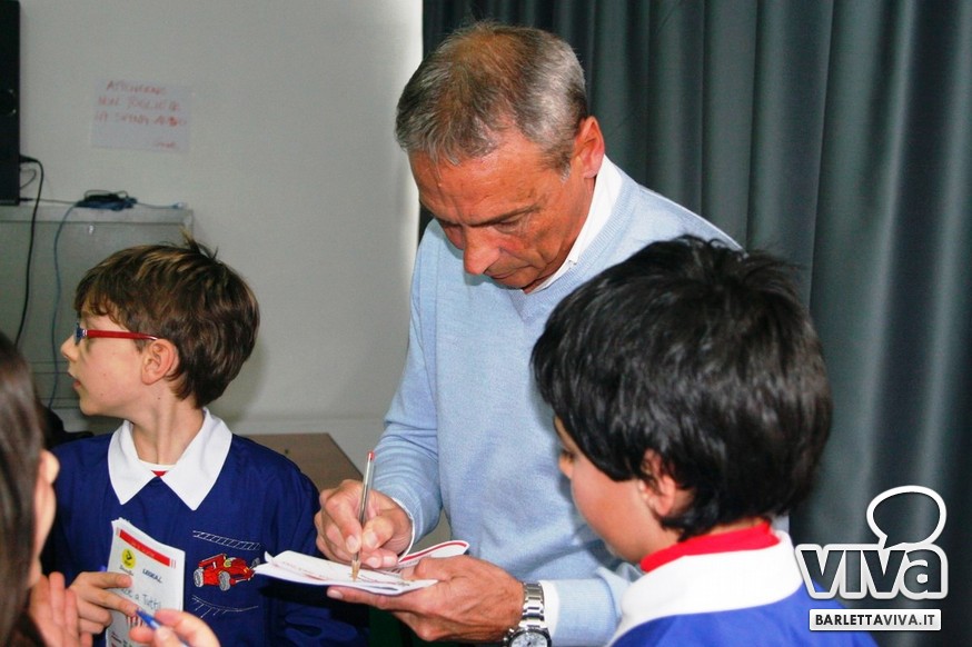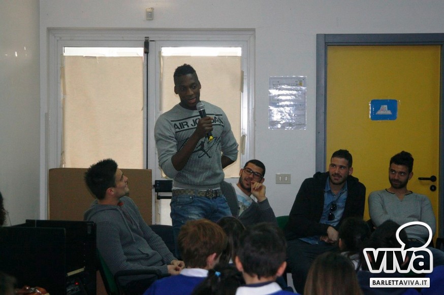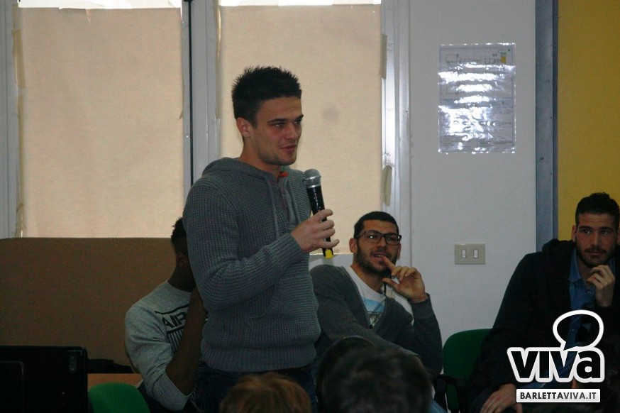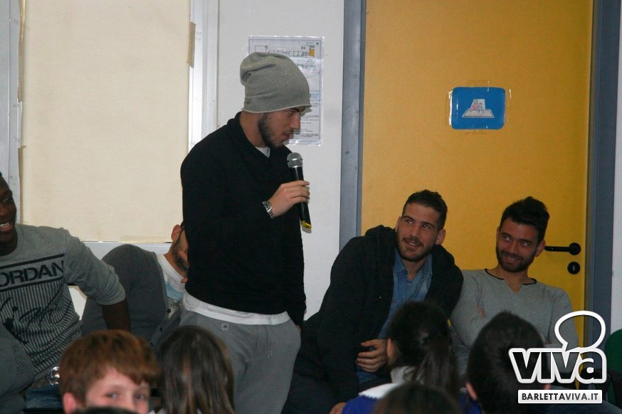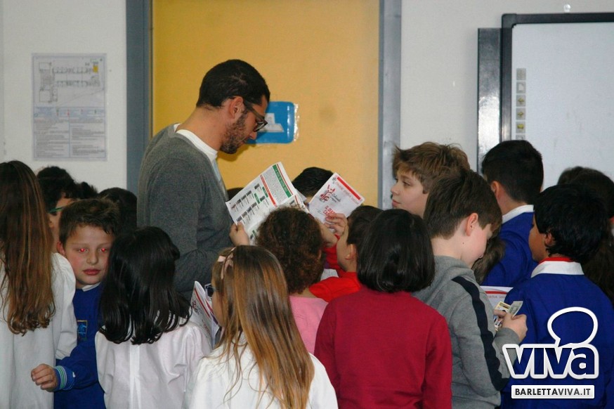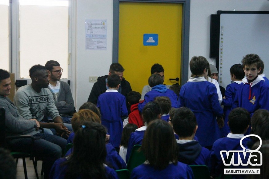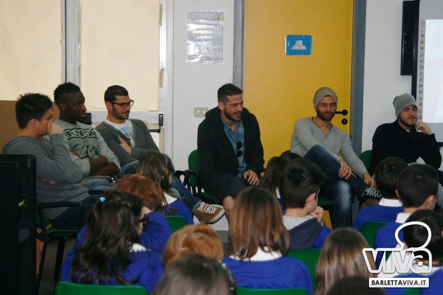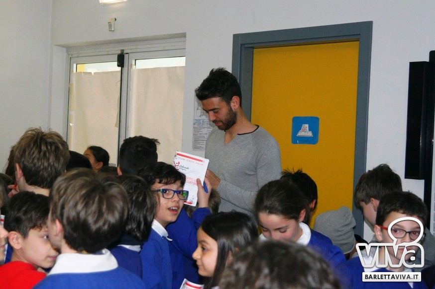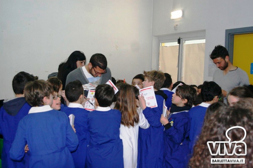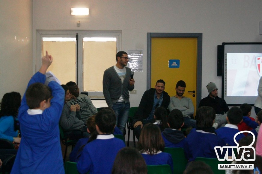 Per un attimo il Barletta dimentica le vicissitudini del campo e si concentra su un'iniziativa extra-calcistica, una delle tante che sono state portate avanti in questa stagione. Ieri mattina è stato ancora tempo di "Calciando si impara": il club biancorosso, dopo la proficua esperienza presso la scuola "Girondi", ha fatto visita alla scuola "Dibari". All'incirca settanta alunni hanno accolto con entusiasmo la "truppa" biancorossa, composta dal segretario generale Damato, dal mister Nevio Orlandi e dai calciatori Camilleri, La Mantia, Legras, Bijimine, Liverani e Innocenti. La gioia contagiosa dei piccoli barlettani è stata evidente durante tutto l'incontro, che si è tenuto presso l'Auditorium della scuola elementare. L'attenta platea ha avuto modo di assistere ad un video inerente all'alimentazione di un calciatore, ed in generale alla corretta alimentazione, poi la parola è passata al mister Nevio Orlandi che ha illustrato tutte le caratteristiche dello staff tecnico e dell'assetto societario. Ai calciatori è poi toccato l'arduo compito di rispondere alle domandi - più o meno pungenti - dei piccoli e curiosi tifosi. Un'esultanza in piena regola è arrivata quando è stato proiettato il video del gol di La Mantia in Barletta-Frosinone, un ottimo modo per trasmettere agli scolari la voglia di lottare sempre e di non mollare anche nei momenti più difficili. I ragazzi si sono poi scatenati con la parte dedicata agli autografi, all'interno della quale è scattata una vera e propria "caccia all'autografo". I protagonisti della stagione del Barletta Calcio si sono concessi molto volentieri ai piccoli tifosi, mostrando sorrisi convinti e facendosi immediatamente contagiare dal latente entusiasmo.