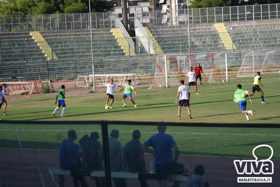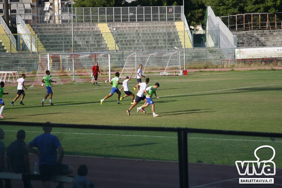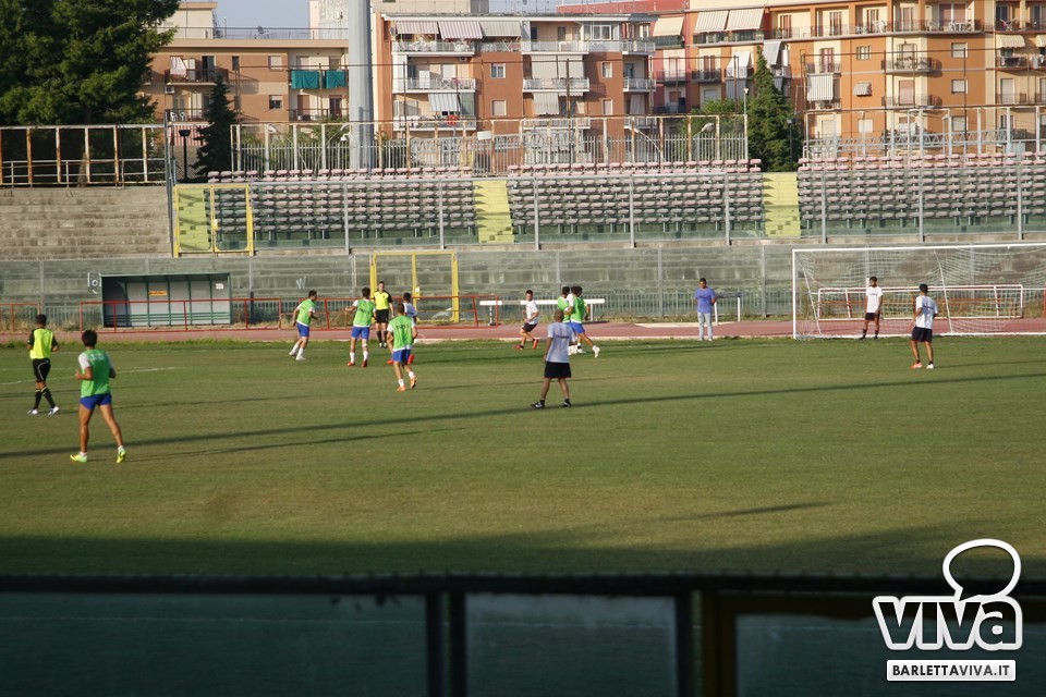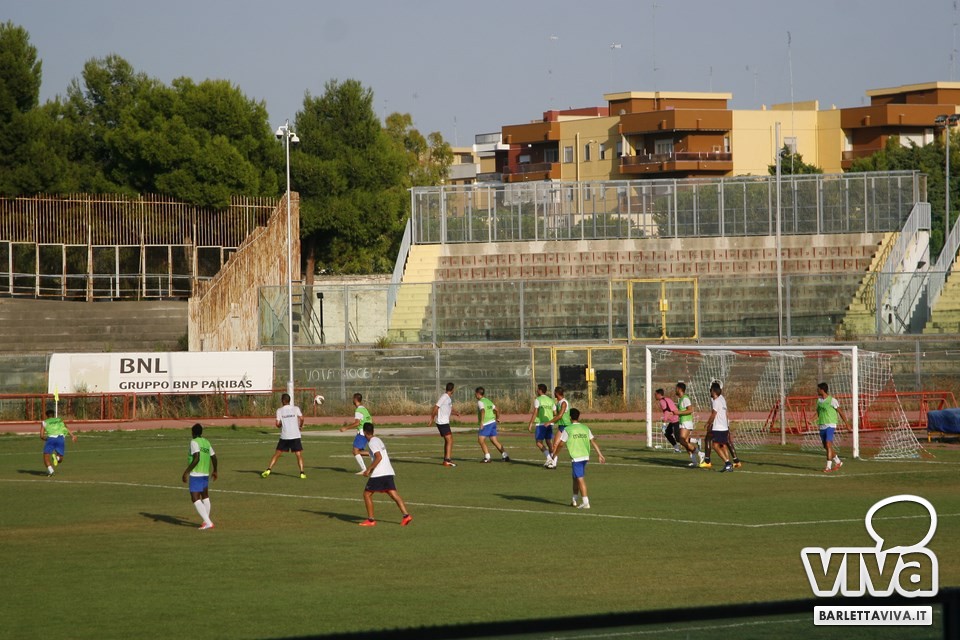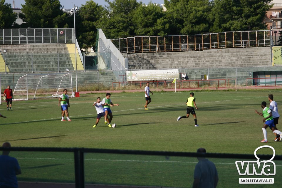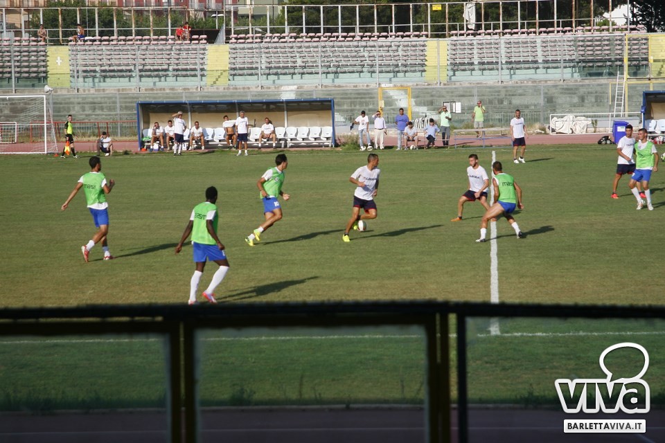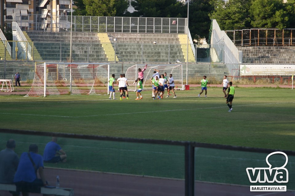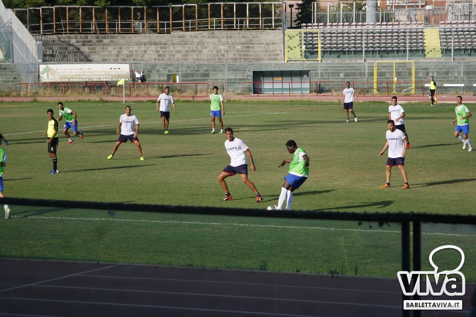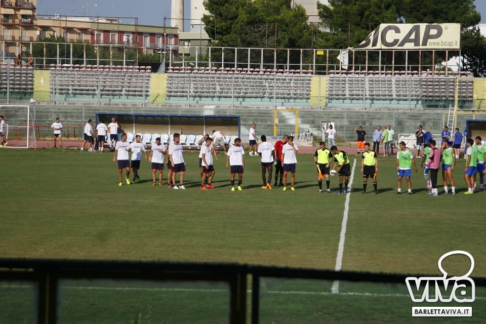 Mister Sesia schiera dal 1' Liverani tra i pali, davanti a cui agiscono Regno, Radi, Zammuto (al posto di Stendardo ndr che aveva cominciato dal 1' domenica) e Cortellini. In mediana, spazio ancora a Branzani e Quadri, accanto a cui viene schierato il giovane Matera. In attacco, confermati Venitucci, Floriano e Fall. La partenza dei biancorossi è migliore, con la velocità dei tre d'attacco che mette subito in apprensione la retroguardia ospite. Al 6' si sblocca la partita: Venitucci si invola sulla fascia, vince un rimpallo e serve bene al centro Fall, che da pochi metri beffa il portiere tranese. La reazione della Vigor tarda ad arrivare, e il Barletta ne approfitta per portarsi sul 2-0: dopo un lungo lancio, Fall addomestica bene la palla, alza la testa e serve Venitucci, che dall'altezza del dischetto del rigore gonfia la rete. Dopo la "sfuriata" iniziale, il Barletta, complice un gran caldo, rallenta i ritmi, e la partita procede senza troppe emozioni fino al termine della prima frazione. Nella ripresa, le squadre rientrano in campo agli ordini della terna arbitrale barlettana, composta dal fischietto Insanguine e dagli assistenti Fumarulo e Vitobello. Mister Sesia opta per un Barletta totalmente nuovo, con De Martino in porta, Guarco, Kiakis, Stendardo e Sokoli in difesa, Legras, Mantovani e il "Berretti" Sette in mediana, il baby Scalise, Biancolino e Rizzitelli in attacco. Il Barletta prova a proiettarsi in avanti alla ricerca del tris, ma Mantovani prima (tiro alto sulla traversa) e Biancolino poi (due occasioni per "Il Pitone") non riescono a centrale lo specchio della porta. Si chiude dunque sul 2-0 l'ultimo match amichevole dei biancorossi, che hanno accumulato altri minuti importanti in vista dell'esordio di sabato. Al "Torre", tra poco più di 48 ore, si farà sul serio: scenderanno in campo il Savoia dell'ex Meduri e il Barletta per il secondo turno del girone di Coppa Italia Lega Pro.