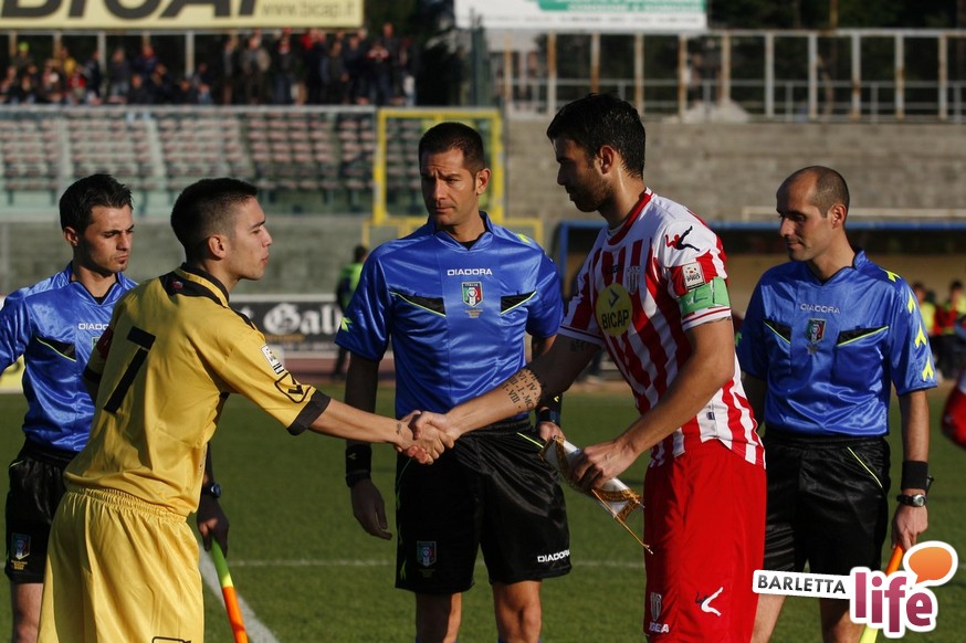 Più che le urla di gioia o incitamento, oggi pomeriggio sul prato del "Cosimo Puttilli" hanno vinto gli sbadigli e le contestazioni. A fare da protagonista sul rettangolo verde è stato il contorno, in mancanza della "portata principale", il bel gioco, per il quale il Barletta deve ancora masticare tanto pane duro. Un altro passo indietro per i biancorossi, che non hanno mai vinto in casa e non sono riusciti ad avere ragione della Nocerina, ossia l'unico avversario che li segue in classifica (complice anche una penalizzazione di due punti) ma non sul campo, stando a quanto visto sul rettangolo verde. Soporifera per larghi tratti, la gara si è animata solo nel finale con le occasioni avute da Palma e Cicerelli su tutte. Al fischio finale di Candeo è stata pesantemente contestata la dirigenza biancorossa, con il confronto tra una rappresentanza di tifosi e il direttore generale Martino che ha fatto da sequel al fischio finale. I punti all'attivo sono 9, gli obiettivi della società sulla lunga durata, ma il presente è duro da digerire e vivere in via Vittorio Veneto. Riviviamo lo 0-0 tra Barletta e Nocerina attraverso gli scatti fotografici colti dagli obiettivi di Enrico Gorgoglione: