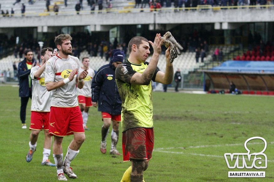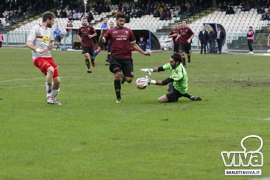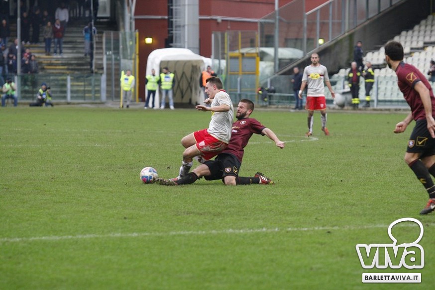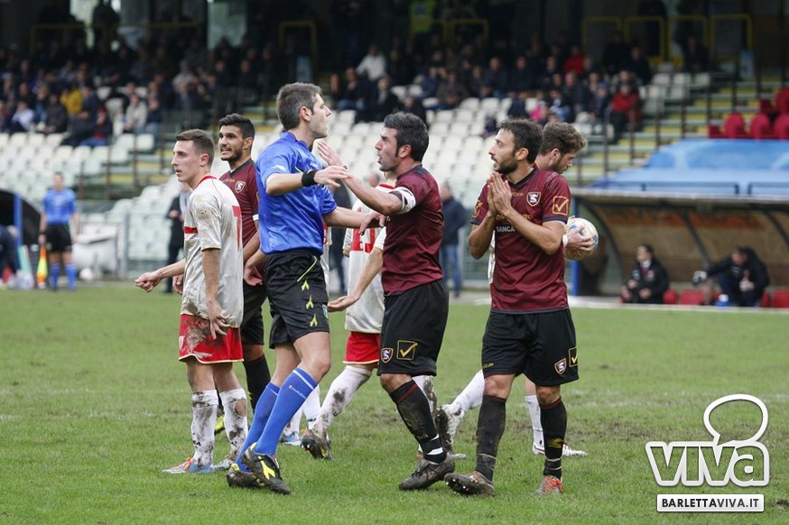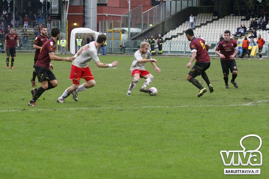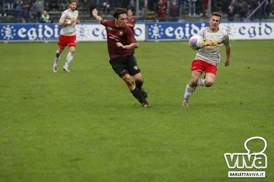 Tre schiaffi con vista sulla costiera amalfitana riportano il Barletta sulla terraferma. All'Arechi di Salerno, gli uomini di mister Orlandi hanno ceduto per 3-0 alla Salernitana del neo-tecnico Gregucci. Un ko secco, frutto di una prestazione opaca che fa registrare un importante passo indietro nel percorso di miglioramento denotato nel 2014 biancorosso. Dopo venti minuti giocati alla pari, la Salernitana ha presto preso metri e possesso della manovra, risultando superiore a Camilleri e compagni sul piano del ritmo e del palleggio. I centri di Gustavo, Mancini e Mendicino, conditi dall'ispirazione di Pasquale Foggia hanno condannato il Barletta alla nona sconfitta stagionale, la più pesante sul piano numerico e una delle più opache sotto il profilo del gioco e del carattere. Del pomeriggio dell'Arechi si salvano soprattutto gli oltre duecento tifosi di fede barlettana presenti in terra cilentana, ora il prossimo ostacolo si chiama Lecce. Riviviamo le emozioni principali di Salernitana-Barletta attraverso gli scatti fotografici ripresi dagli obiettivi idi Enrico Gorgoglione.