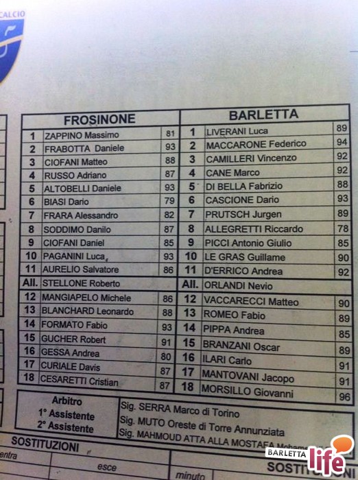 QUI BARLETTA: Ai biancorossi mancheranno lo squalificato Cicerelli e l'infortunato La Mantia (crociato, sei mesi di stop), convocati i "Berretti" Mastroberti e Morsillo. La nota positiva arriva invece da Andrea Pippa che è recuperato e fa quindi l'esordio nella lista dei convocati in questa stagione, anche se parte dalla panchina, alla pari di Romeo: dentro Pippa e Maccarone. In campo anche il francese Legras, preferito a Mantovani e Ilari accanto a Prutsch e Allegretti. In attacco ci sono Picci e D'Errico.FROSINONE (4-3-3): Zappino; Frabotta, Biasi, Russo, Ciofani M.; Soddimo, Frara, Altobelli; Paganini, Ciofani D., Aurelio. A disp: Mangiapelo, Blanchard, Formato, Gucher, Gessa, Cesaretti, Curiale. All: Stellone.