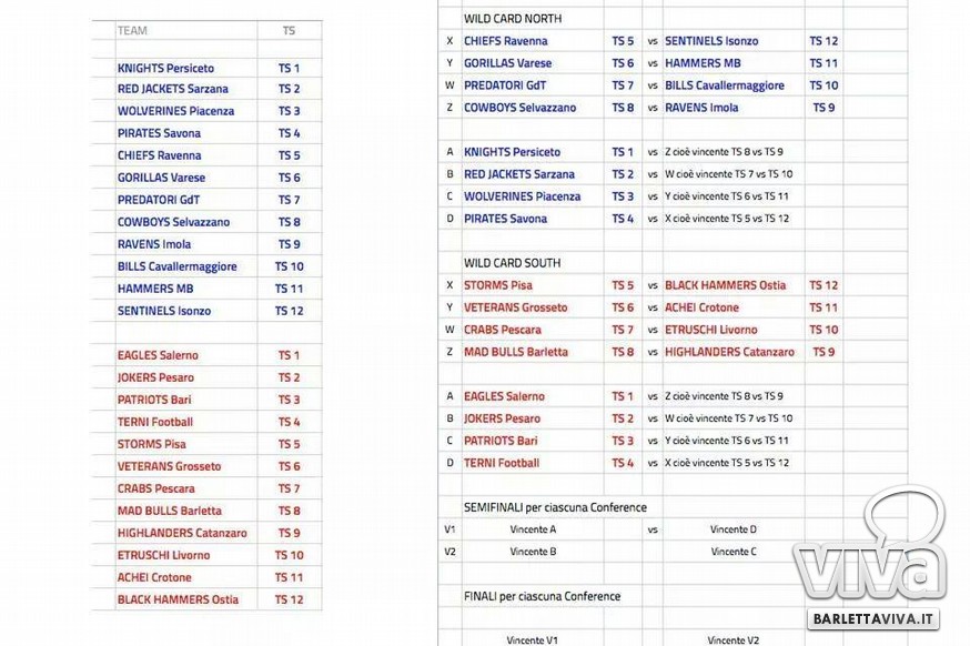 Agganciati i playoff conquistando il secondo posto nel girone B della Terza Divisione della South Conference, per i Mad Bulls Barletta è tempo di pensare alla seconda fase del Campionato Nazionale di Football Americano Cif9 Fidaf, coincidente con i playoff: nella giornata di ieri sono andati in archivio i campionati, e i "tori matti" hanno conosciuto il nome del prossimo avversario. A dispetto delle previsioni, che vedevano come papabili avversari Achei Crotone, Pescara Crabs e Etruschi Livorno, Seccia e compagni- in campo sempre con il logo di Barlettalife.it sui caschi- il 24 maggio ospiteranno al "Manzi-Chiapulin" gli Highlanders Catanzaro.