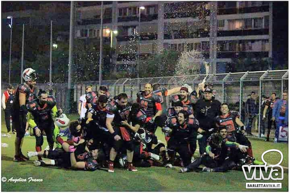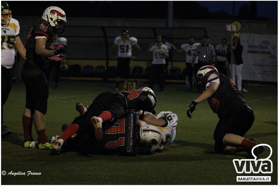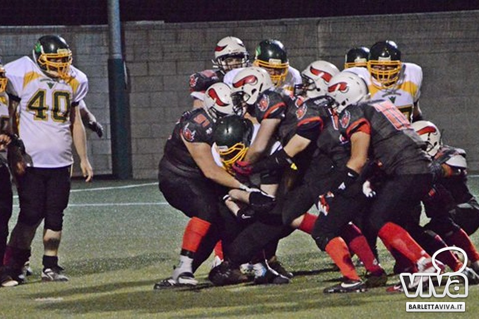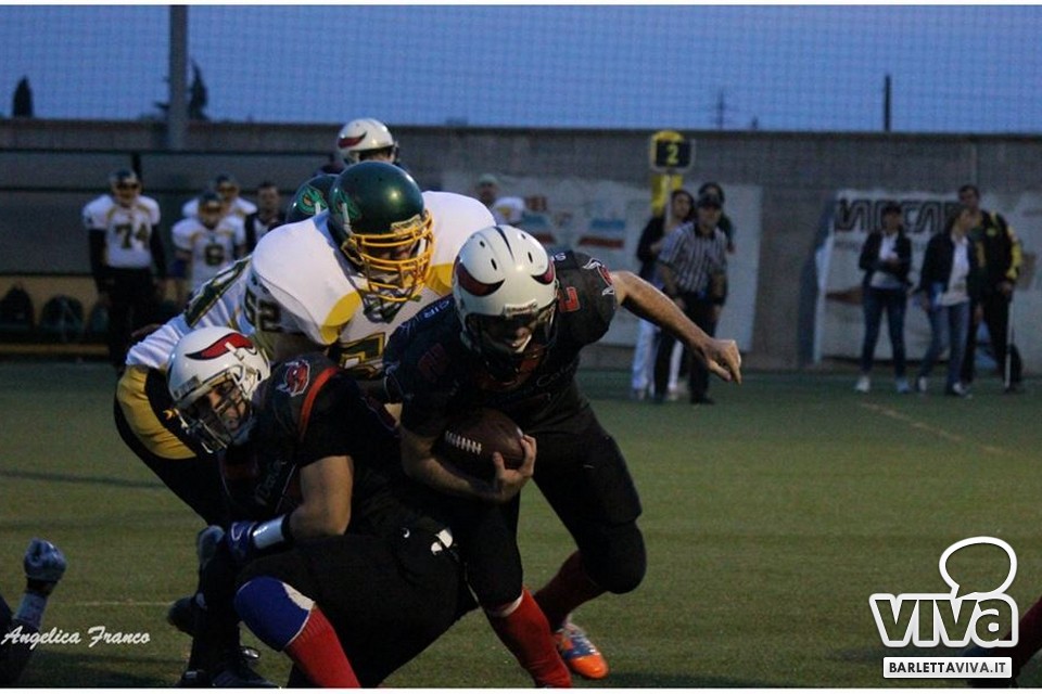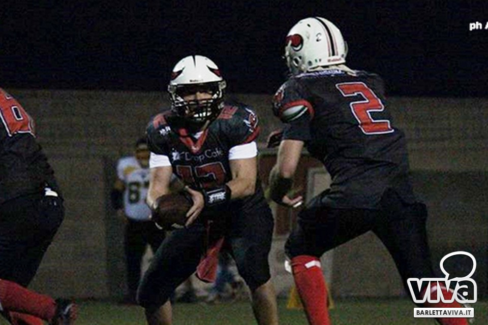 Una vittoria per archiviare la prima parte di stagione e proiettarsi sui playoff. Sabato sera i Mad Bulls Barletta hanno superato agevolmente e largamente sul sintetico del "Manzi-Chiapulin" i Goblins Lanciano, giunti all'ombra di Eraclio in edizione rimaneggiata, collezionando un largo 56-0. Successo numero 5 su 6 impegni nel girone, che non è però valso il sorpasso sui Patriots Bari/Team Puglia, vittoriosi per 21-0 sui Brindisi Bucks e primi al termine delle qualificazioni per effetto del miglior parziale negli scontri diretti contro i Tori Matti del poker tecnico Papalino-Banks-Calò-Allegretti. I Mad Bulls hanno così terminato il gruppo B in seconda posizione e torneranno in campo nell'ultimo weekend di maggio per le Wild Card, contro un avversario da definire: per avere la griglia definitiva da Nord a Sud, occorrerà attendere la griglia ufficiale della post-season, che sarà nota soltanto all'indomani dell'incontro del 23 Maggio tra Crabs e Gladiatori.