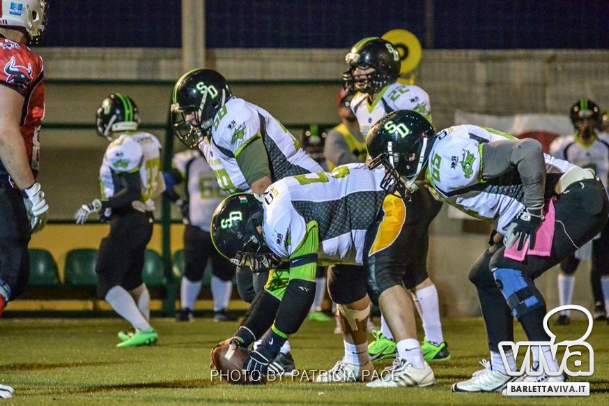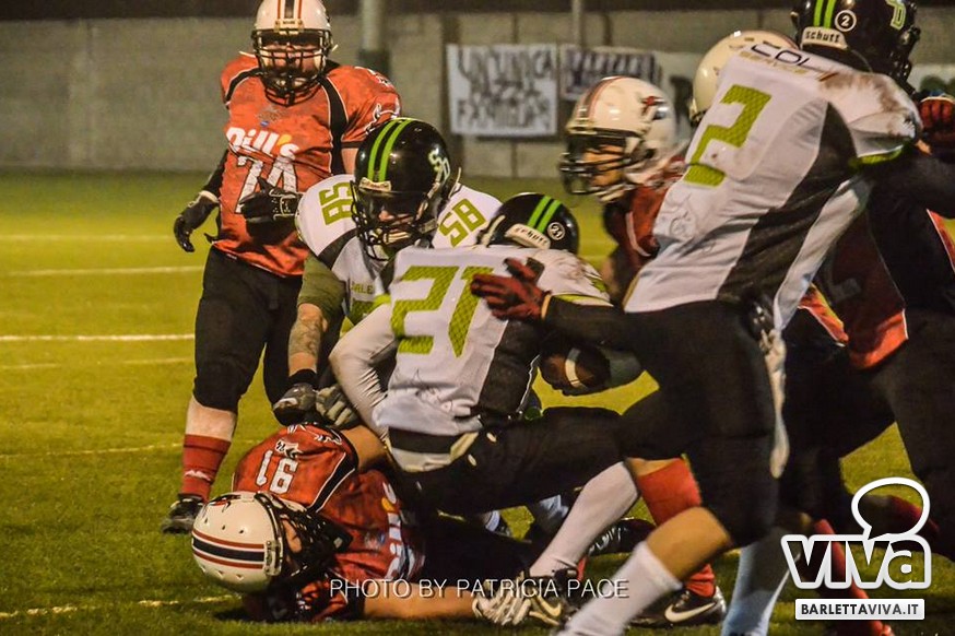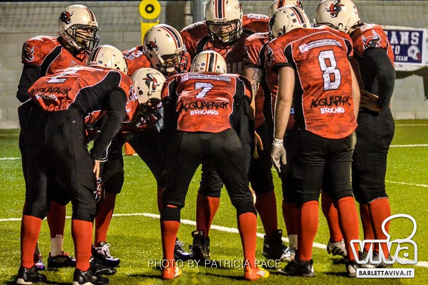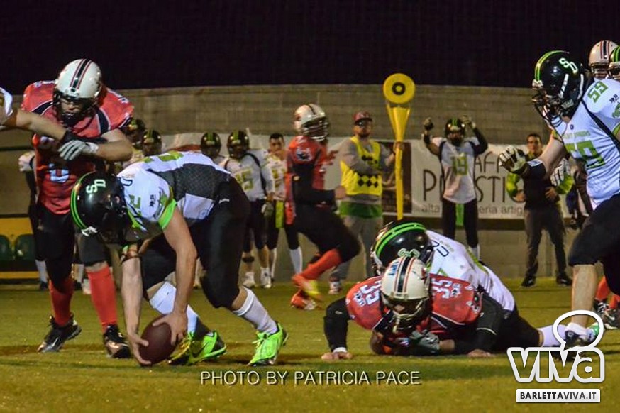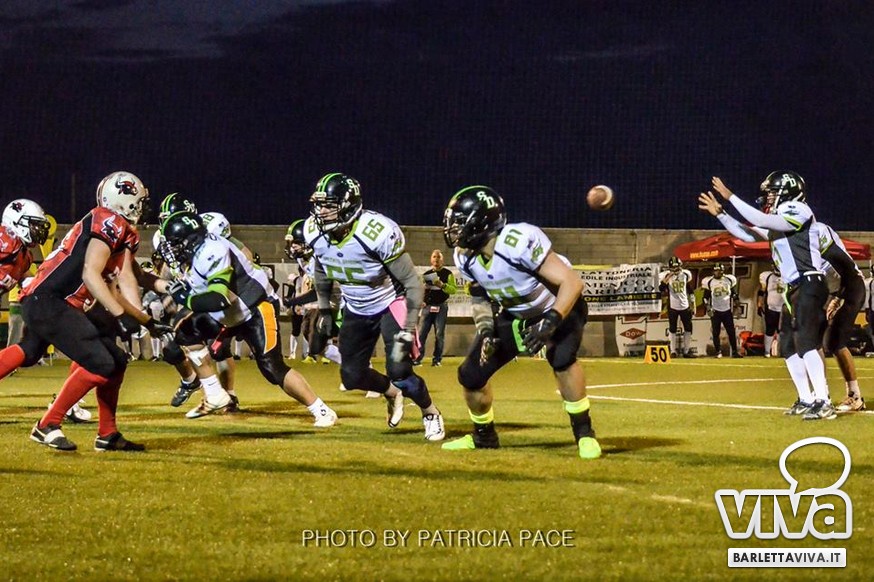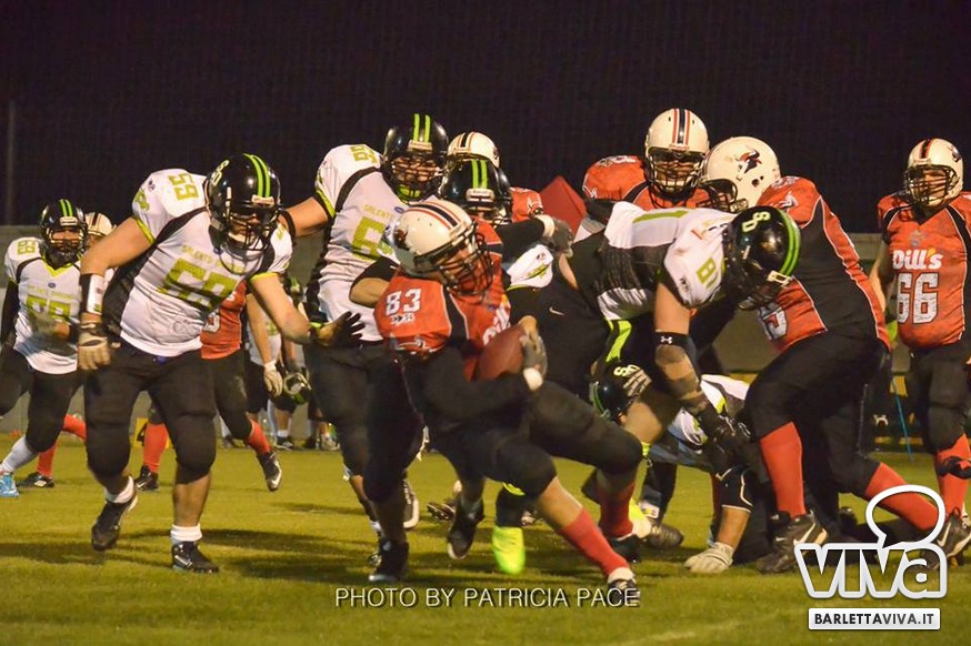 La cronaca- Ci si aspettava una partita combattuta e così è stato. Avvio intenso degli ospiti, che passavano in vantaggio con un attacco al secondo drive, favorito da un'errata lettura della difesa di casa su un pass diretto in endzone. Il provvisorio 0-8 destava i padroni di casa, che avviavano il pressing delle linee di difesa barlettane Allegretti, Melis e Pellegrino costringevano a un lancio forzato il Quarter Back ospite: sulla palla arrivava il CB dei Mad Bulls Nico Curci, che grazie ai precisi blocchi dei LB Torre e Maselli, si involava per quasi 50 yards in touchdown, seguito da una trasformazione non riuscita che portava così il risultato sul 6-8 per i salentini: a questo punto la squadra barlettana sospinta dal proprio pubblico prova a sfondare le ultime resistenze salentine riuscendoci con una corsa autorevole di Pietro Bruno, seguita da una realizzazione questa volta andata a buon fine per il definitivo 14-8.