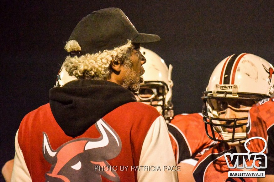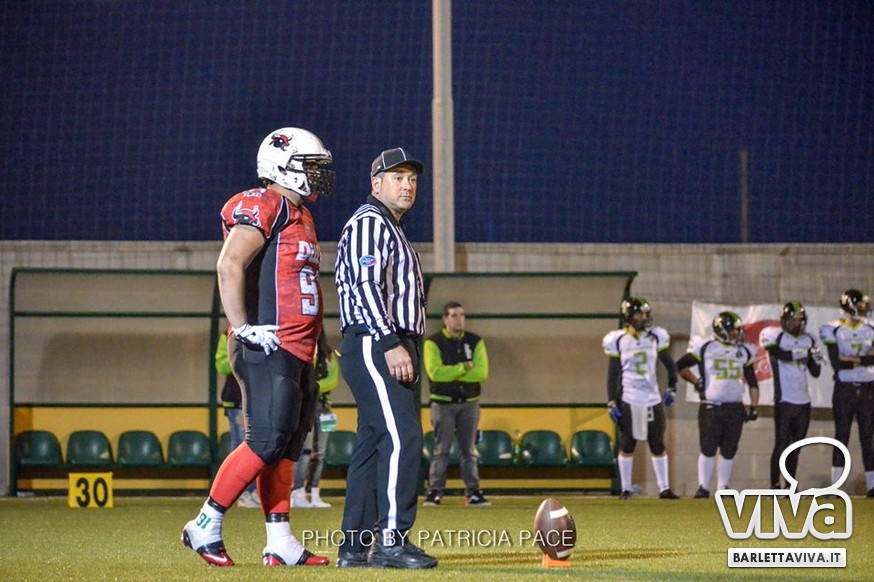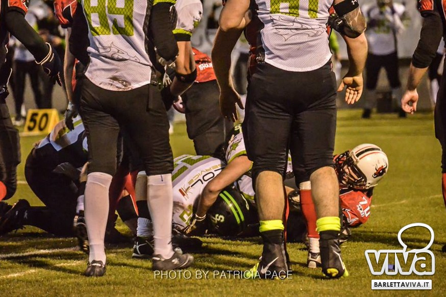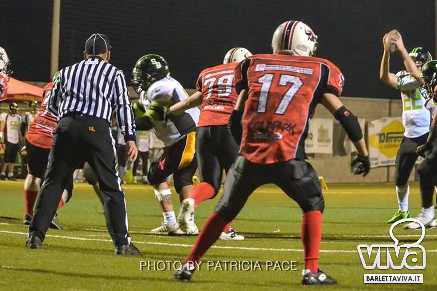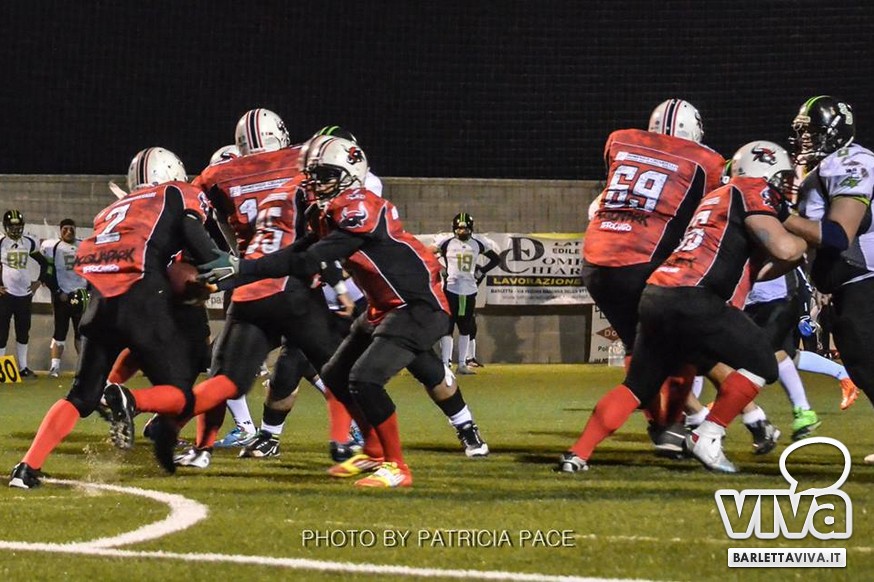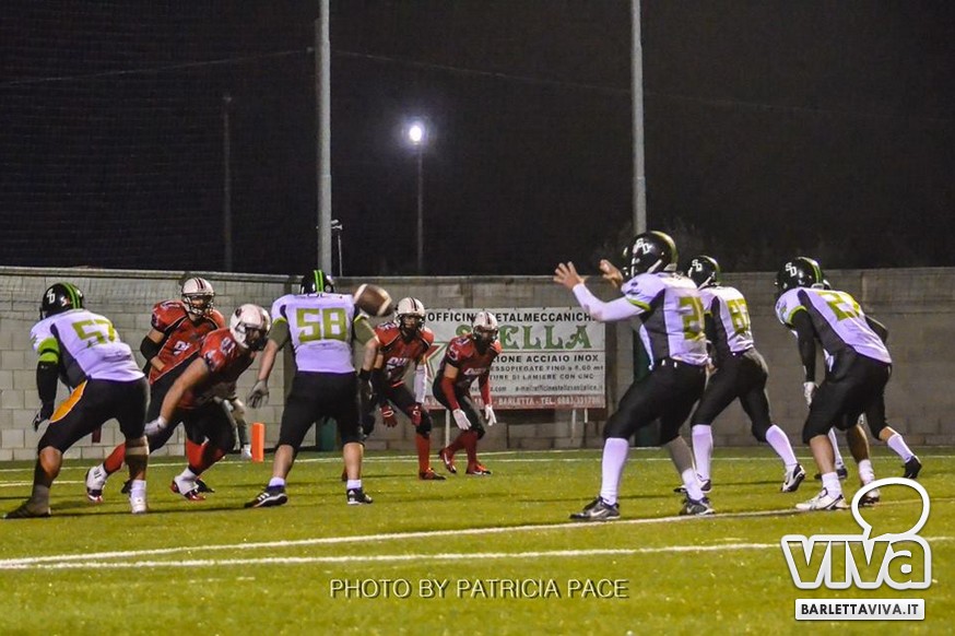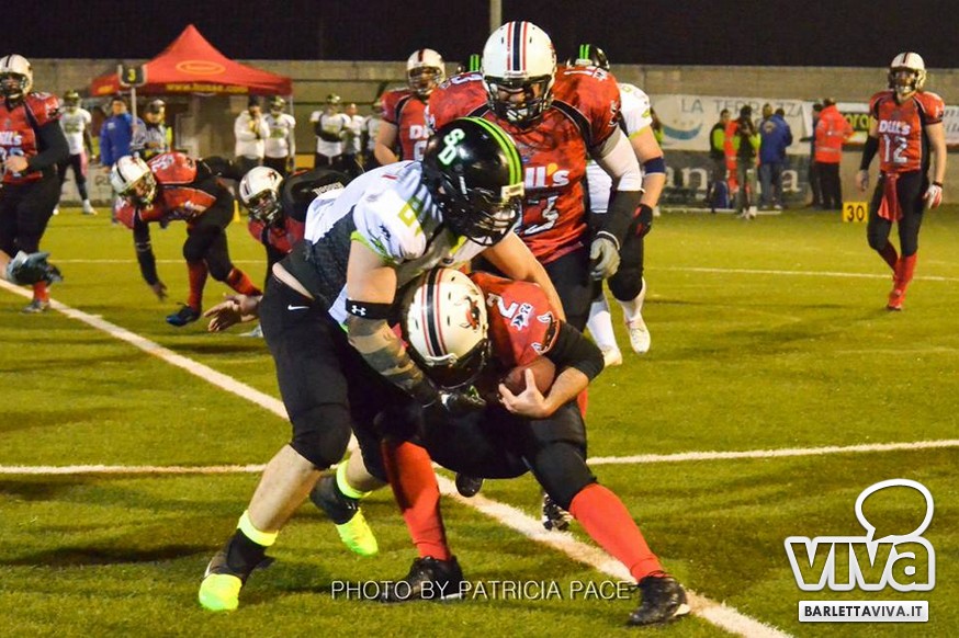 La cronaca- Ci si aspettava una partita combattuta e così è stato. Avvio intenso degli ospiti, che passavano in vantaggio con un attacco al secondo drive, favorito da un'errata lettura della difesa di casa su un pass diretto in endzone. Il provvisorio 0-8 destava i padroni di casa, che avviavano il pressing delle linee di difesa barlettane Allegretti, Melis e Pellegrino costringevano a un lancio forzato il Quarter Back ospite: sulla palla arrivava il CB dei Mad Bulls Nico Curci, che grazie ai precisi blocchi dei LB Torre e Maselli, si involava per quasi 50 yards in touchdown, seguito da una trasformazione non riuscita che portava così il risultato sul 6-8 per i salentini: a questo punto la squadra barlettana sospinta dal proprio pubblico prova a sfondare le ultime resistenze salentine riuscendoci con una corsa autorevole di Pietro Bruno, seguita da una realizzazione questa volta andata a buon fine per il definitivo 14-8.