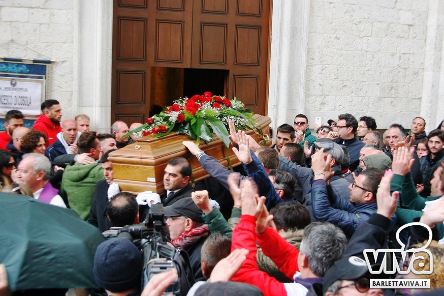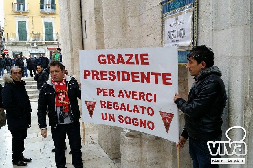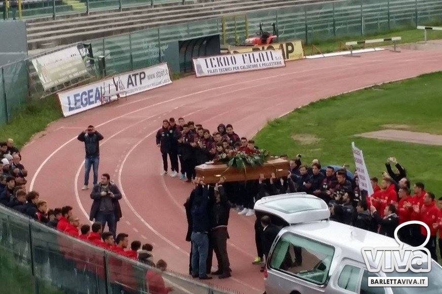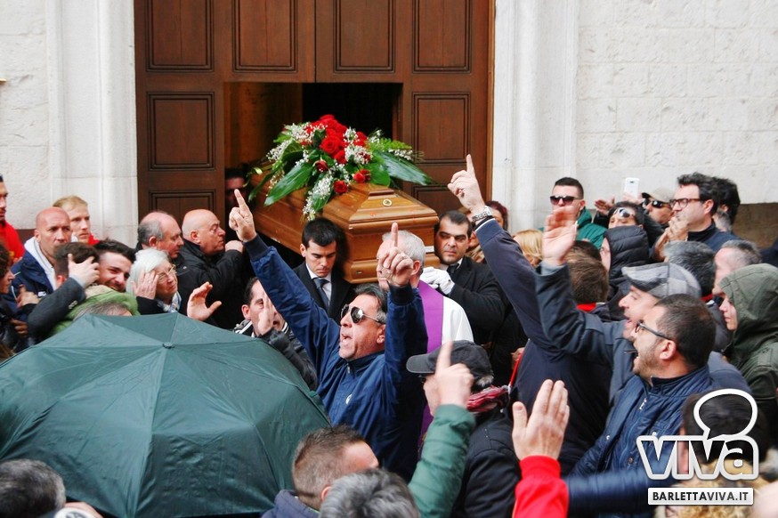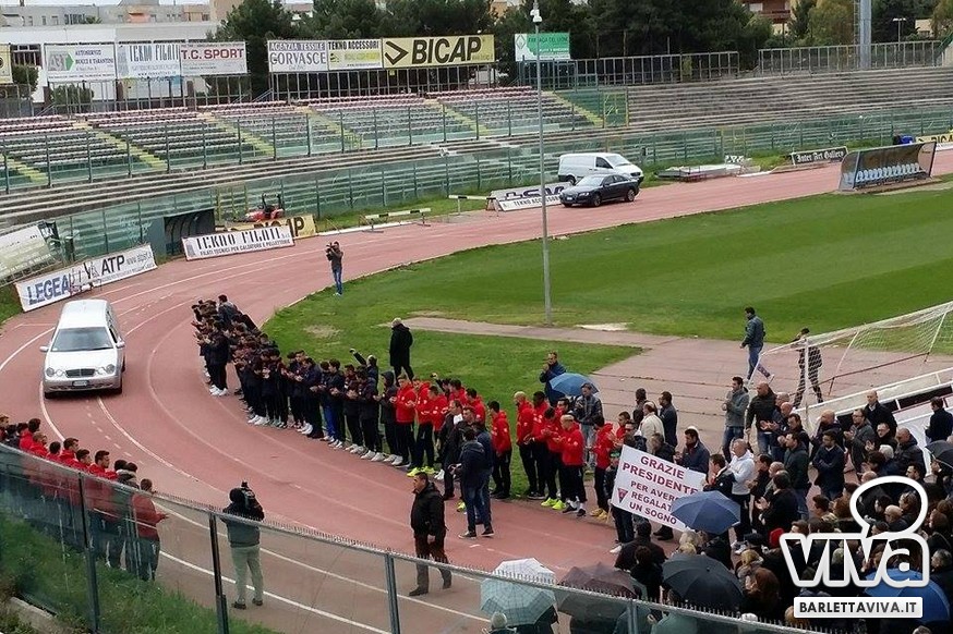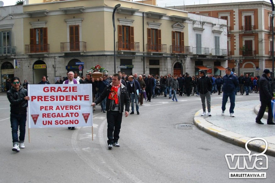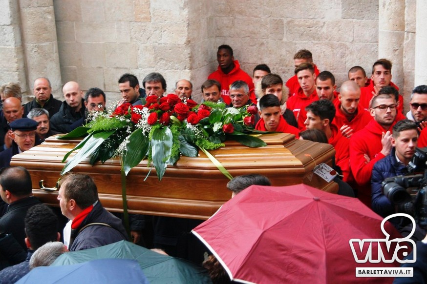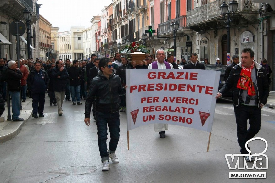 "Franco Di Cosola sempre nei nostri cuori, uno di noi" il coro più gettonato tra i tanti aficionados biancorossi, che hanno voluto ricordare e omaggiare la famiglia e la figura dell'ex presidente: dopo la celebrazione eucaristica di don Leonardo Doronzo, è stato tempo del lungo corteo. Il clima uggioso e la pioggia si sono confusi con le lacrime e nel cielo della Barletta sportiva si è condensata un'aura di silente dolore, che si confondeva con dolci ricordi ogniqualvolta in cui tra la folla accorsa il chiacchiericcio o qualche coro richiamavano alla mente immagini di paradossale gioia. A tifosi del tempo si sono affiancati giovanissimi che quei tempi li hanno conosciuti solo nei racconti, con una voglia di celebrare e ricordare unanime: non sappiamo cosa ci sia dopo la morte, di certo la memoria rende perpetue certe cose e certe persone. Uno striscione all'esterno del Santo Sepolcro, realizzato dal Gruppo Erotico, recitava "Hai scritto la storia e la storia non morirà mai". E allora vien da pensare che per la Barletta sportiva Franco Di Cosola, meglio conosciuto come "u presdn't", non morirà mai.