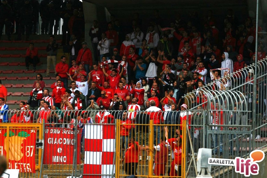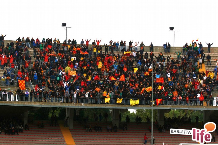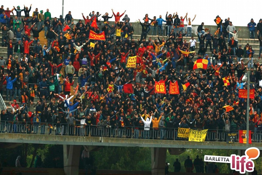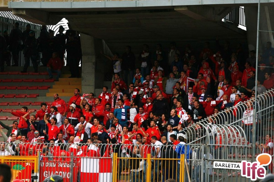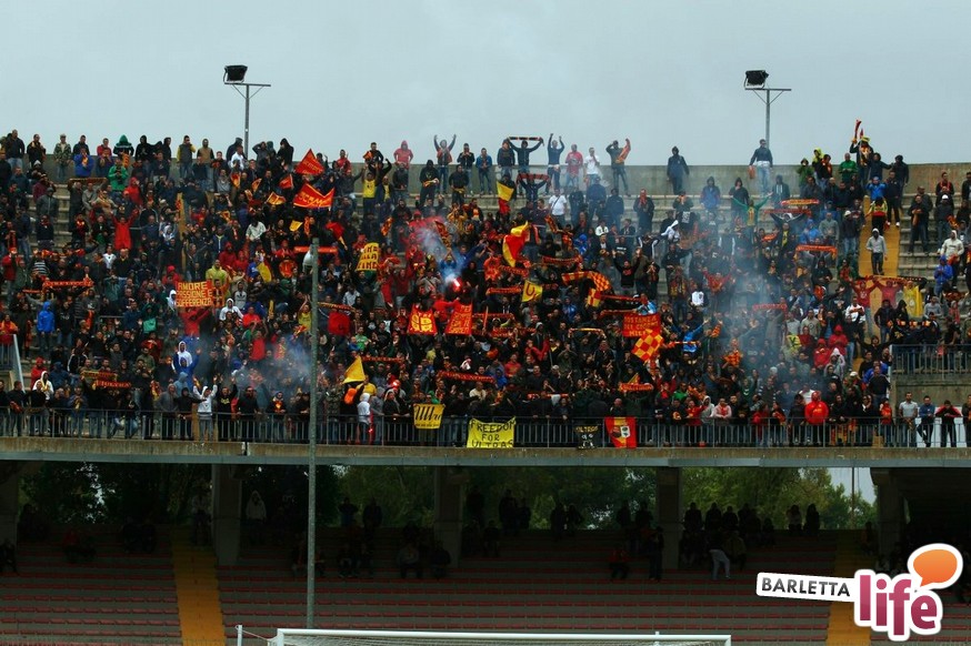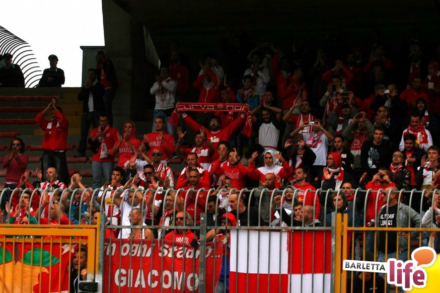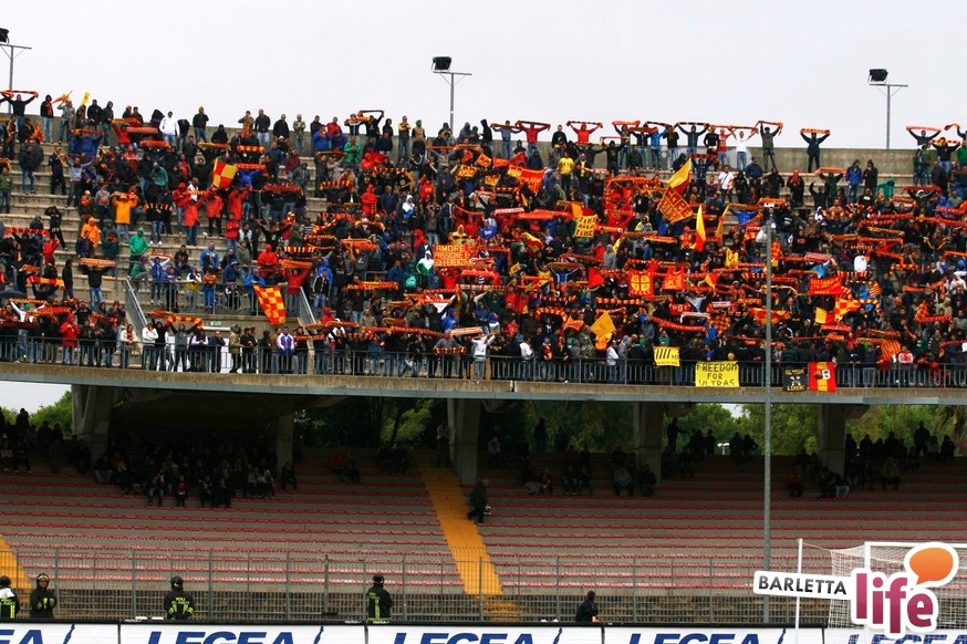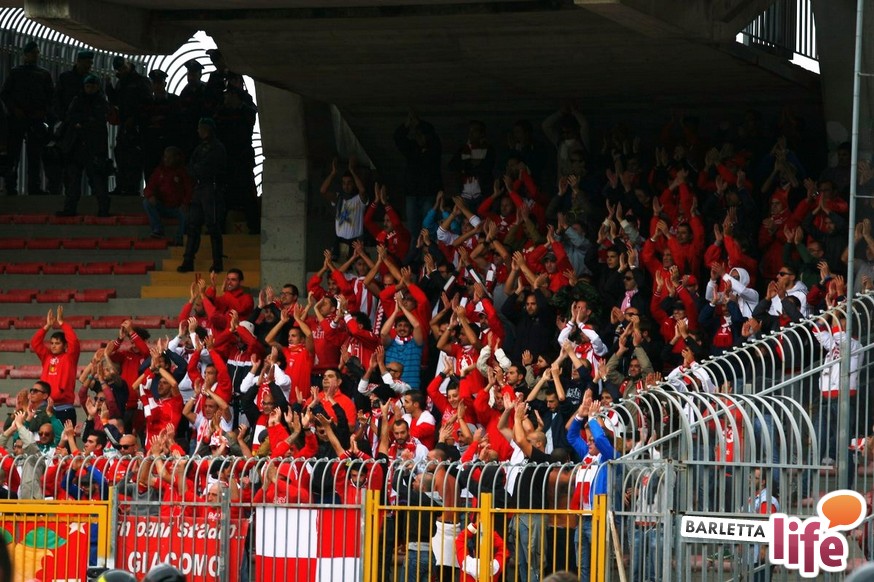 Emozioni sin dal pre-gara, con una sinfonia di canti che sovrastano anche le poco piacevoli esplosioni di bombe-carta sulla pista di atletica che hanno caratterizzato i minuti precedenti il fischio d'inizio di Sacchi. Di lì via con cori, sfottò, sciarpate a tinte biancorosse e anche qualche intonazione ad personam, in particolare nei confronti del capitano leccese Fabrizio Miccoli, non propriamente "amato" dal colorato e colorito tifo barlettano, in particolar modo per le infelici dichiarazioni riferite al giudice Falcone del 35enne salentino diffuse durante l'estate. L'importante è divertirsi, e allora se in campo la squadra soffre ma rintuzza colpo su colpo gli attacchi avversari, si scherza sulla stitichezza biancorossa in chiave offensiva: "Quando segnerai, quando vincerai…" si chiedono non senza amarezza i supporters di Allegretti e compagni. L'urlo in gola per il centro di Picci, che ha sfiorato la sfera sulla deviazione nella propria porta di Sales, è reciso dalla segnalazione della posizione di fuorigioco del numero 9 barese, così bisognerà attendere ancora due settimane almeno per gioire, complice il turno di riposo venturo per i ragazzi di Orlandi.
