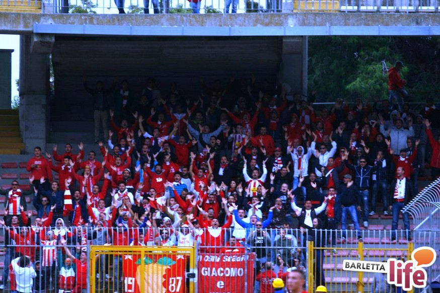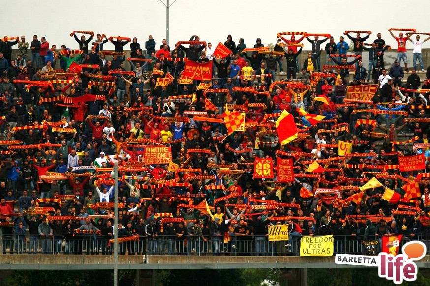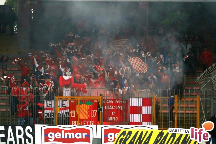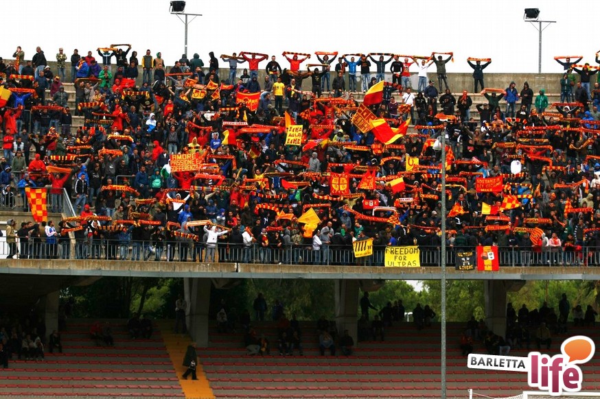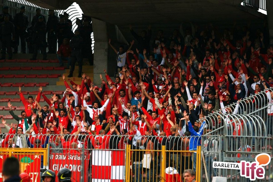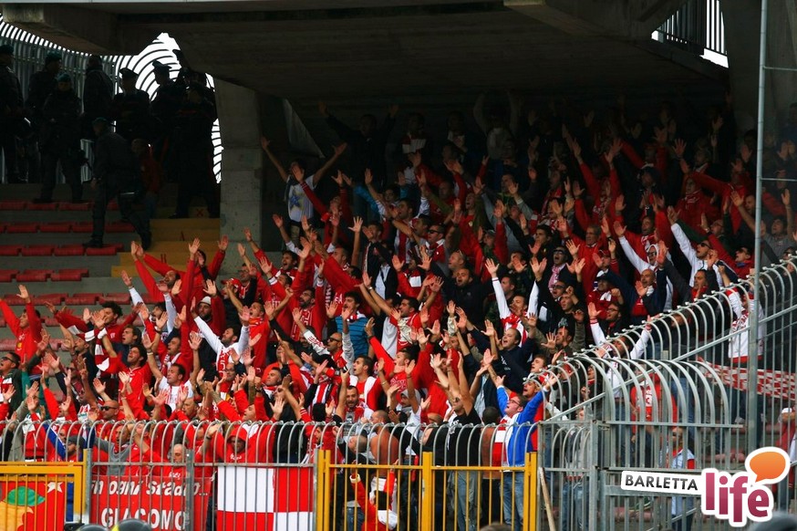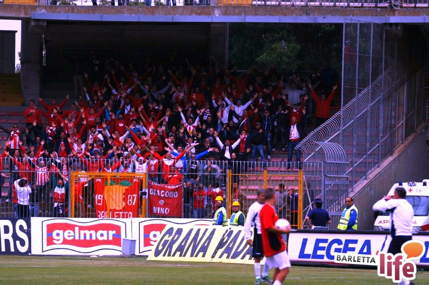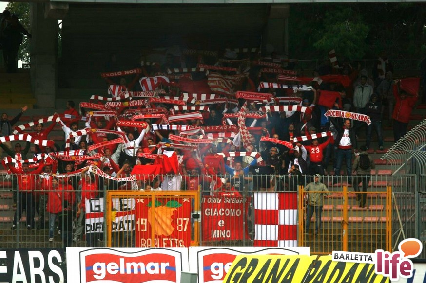 Emozioni sin dal pre-gara, con una sinfonia di canti che sovrastano anche le poco piacevoli esplosioni di bombe-carta sulla pista di atletica che hanno caratterizzato i minuti precedenti il fischio d'inizio di Sacchi. Di lì via con cori, sfottò, sciarpate a tinte biancorosse e anche qualche intonazione ad personam, in particolare nei confronti del capitano leccese Fabrizio Miccoli, non propriamente "amato" dal colorato e colorito tifo barlettano, in particolar modo per le infelici dichiarazioni riferite al giudice Falcone del 35enne salentino diffuse durante l'estate. L'importante è divertirsi, e allora se in campo la squadra soffre ma rintuzza colpo su colpo gli attacchi avversari, si scherza sulla stitichezza biancorossa in chiave offensiva: "Quando segnerai, quando vincerai…" si chiedono non senza amarezza i supporters di Allegretti e compagni. L'urlo in gola per il centro di Picci, che ha sfiorato la sfera sulla deviazione nella propria porta di Sales, è reciso dalla segnalazione della posizione di fuorigioco del numero 9 barese, così bisognerà attendere ancora due settimane almeno per gioire, complice il turno di riposo venturo per i ragazzi di Orlandi.