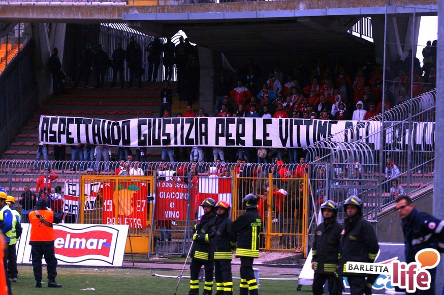C'è tempo anche per il ricordo, per la richiesta di verità, per la riflessione: in avvio di ripresa è stato esposto nella curva biancorossa uno striscione con scritto "Aspettando giustizia per le vittime del crollo". Chiaro, eloquente, il ricordo della tragedia che il 3 ottobre 2011 ha scosso Barletta e l'Italia intera. Un vessillo applaudito anche dagli altri settori dello stadio "Via del Mare": l'umanità va, e sarebbe pazzesco il contrario, oltre i colori calcistici. Applausi riservati ai protagonisti del match anche a fine gara: i biancorossi dopo lo 0-0 sono andati incontro ai propri tifosi, questa volta non per riceverne la contestazione, come avvenuto domenica scorsa contro la Salernitana, ma per assorbirne la carica e farne tesoro in vista di una pronta risalita. Timidi complimenti, mischiati a qualche ululato di disapprovazione, anche per Martinez e compagni all'uscita dal campo. Sul rettangolo verde è finita 0-0, ma sugli spalti c'è stato più di qualche "goal" virtuale. E ai punti, possiamo dirlo, ha vinto il Barletta.