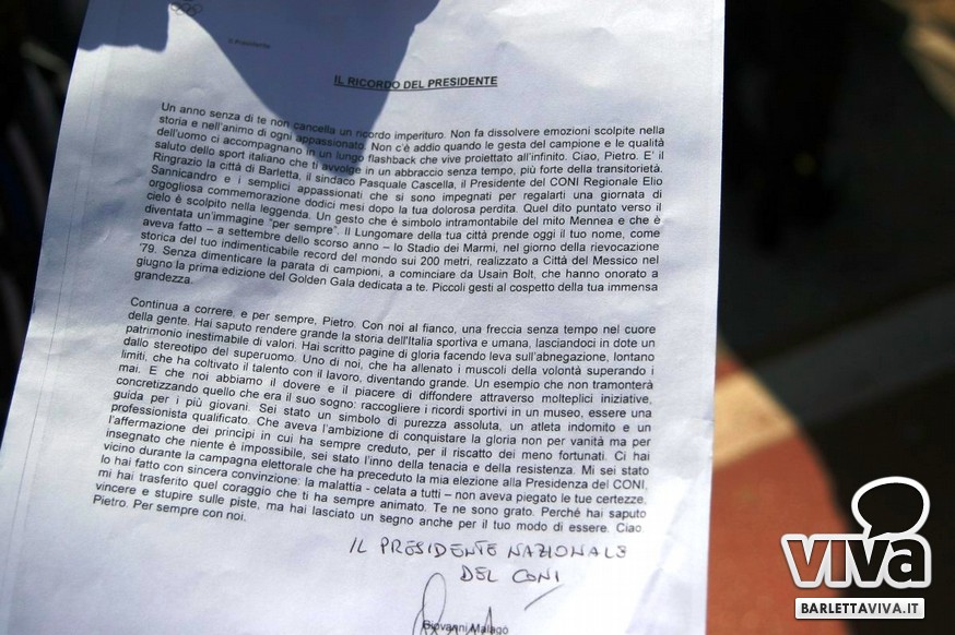 «Un anno senza te non cancella un ricordo imperituro. Non fa dissolvere emozioni scolpite nella storia e nell'animo di ogni appassionato. Non c'è addio quando le gesta di un campione e le qualità dell'uomo ci accompagnano in un lungo flashback che vive proiettato all'infinito. Ciao Pietro. E' il saluto dello sport italiano che ti avvolge in un abbraccio senza tempo, più forte della transitorietà. Ringrazio la città di Barletta, il sindaco Pasquale Cascella, il presidente Coni Regionale Elio Sannicandro e i semplici appassionati, che si sono impegnati per regalarti una giornata di orgogliosa commemorazione. Quel dito puntato verso il cielo è scolpito nella leggenda. Un gesto che è simbolo intramontabile del mito Mennea e che è diventata immagine "per sempre". Il Lungomare della tua città prende oggi il tuo nome, come aveva fatto- a settembre dello scorso anno- lo stadio dei Marmi, nel giorno della rievocazione storica del tuo indimenticabile record del mondo sui 200 metri, realizzato a Città del Messico nel 1979. Senza dimenticare la parata di campioni, a cominciare da Usain Bolt, che hanno onorato a giugno la prima edizione del Golden Gala dedicata a te. Piccoli gesti al cospetto della tua immensa grandezza.