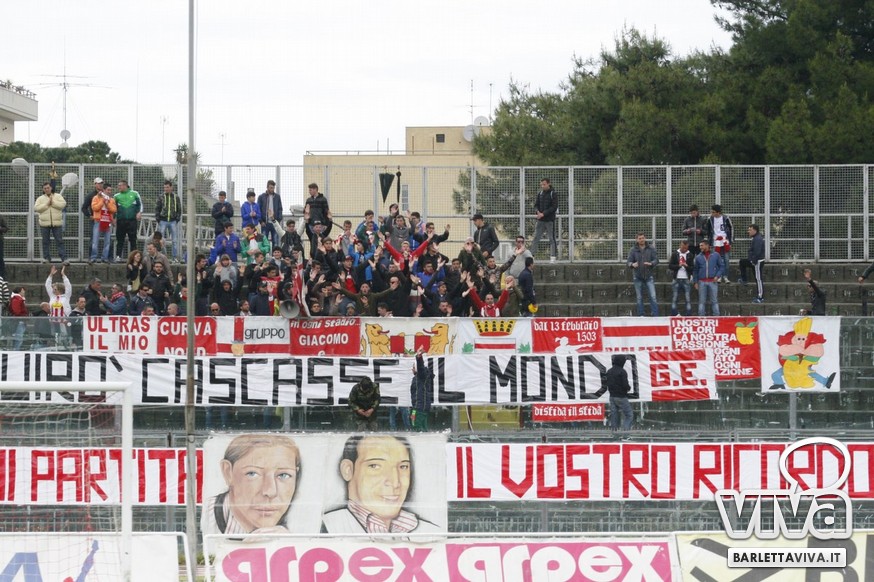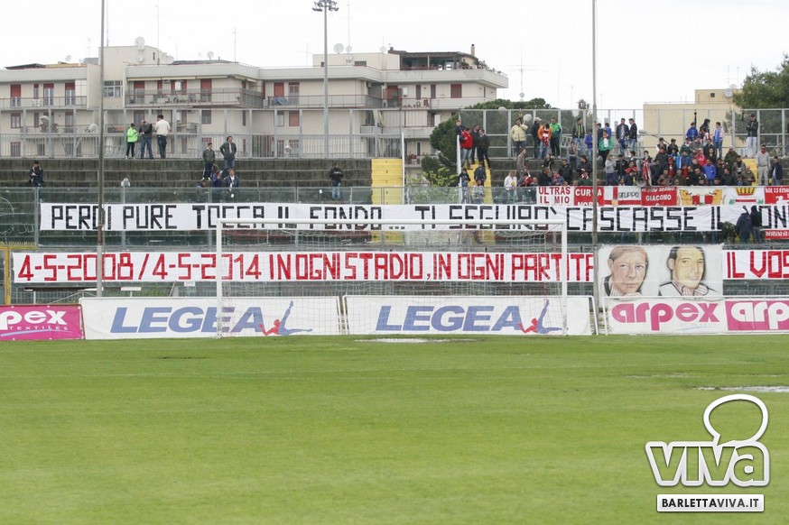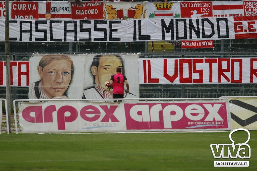La partita giocata ieri pomeriggio dal Barletta contro il Grosseto, insignificante per classifica e campionato, ha avuto una doppia, speciale dedica sul terreno e nell'aria del "Cosimo Puttilli": oggi, 4 maggio, ricorreva infatti il sesto anniversario dalla scomparsa di Mino e Giacomo, due tifosi doc della curva biancorossa morti in un incidente stradale nel 2008. Dal vessillo esposto in loro ricordo, al mazzo di fiori deposto da Luca Livrerani, capitano per l'occasione, fino ai cori in memoria, la giornata ha avuto un panorama emozionante e teso al ricordo.