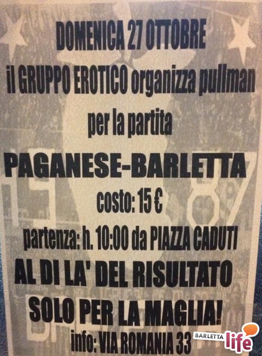 Per la trasferta nella provincia di Salerno, il Gruppo Erotico 1987 sta organizzando dei pullman. Partenza fissata domenica alle 10 da Piazza Caduti, al prezzo di 15 euro, ai quali va aggiunto il prezzo del biglietto. Per adesioni e prenotazioni basta recarsi presso la sede del G.E., in via Romania, 33. "Noi non ti lasceremo mai" recita un antico coretto da curva. Bene ricordarsene, per avviare il viaggio verso Pagani.