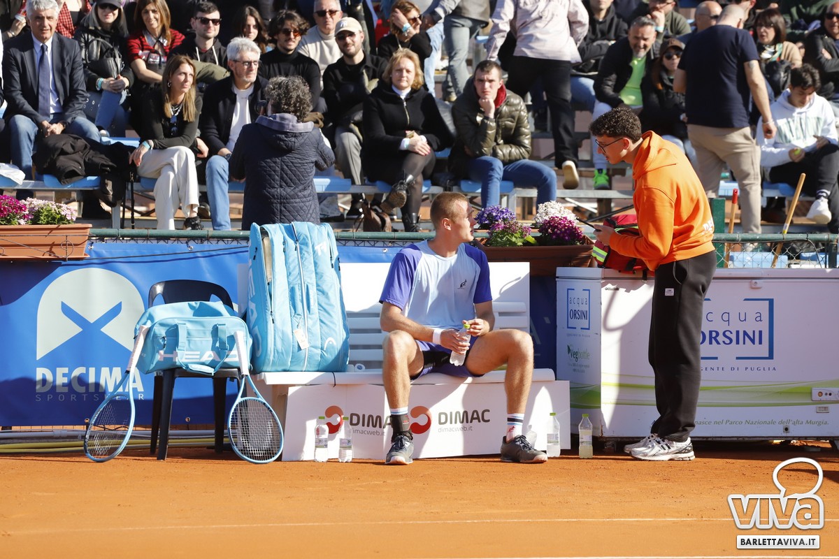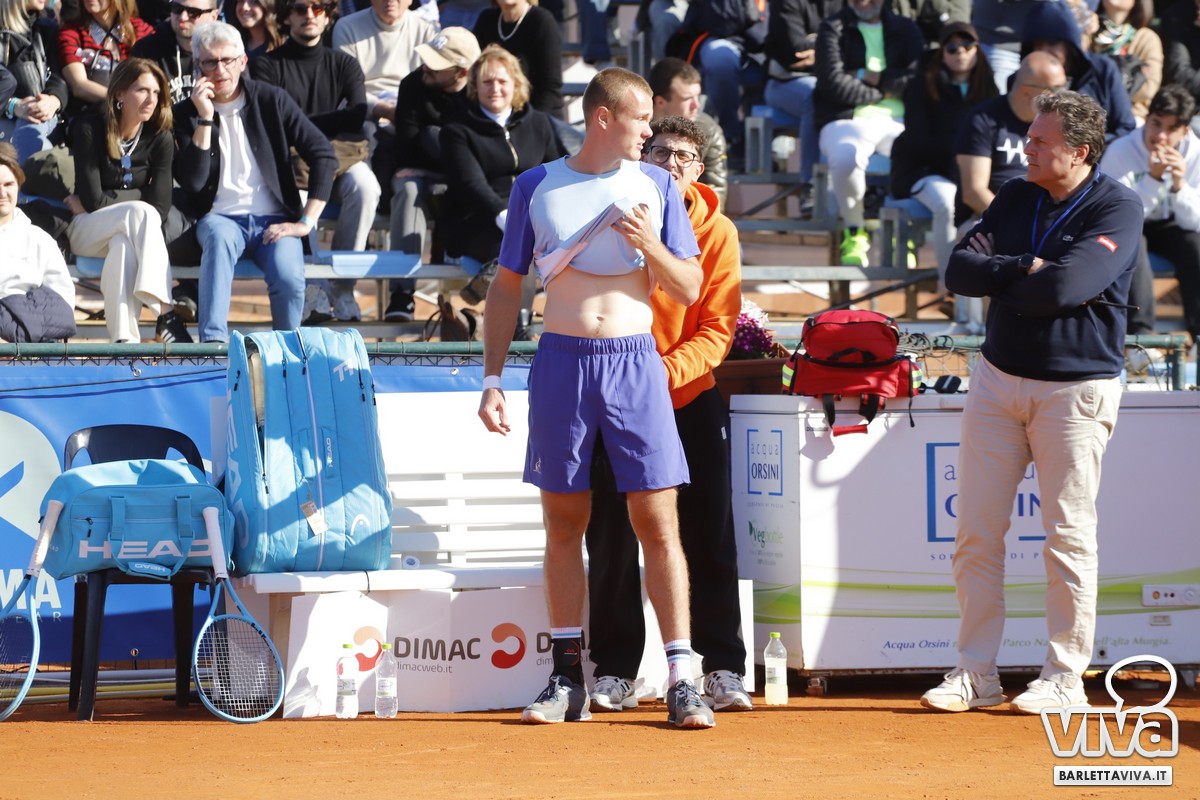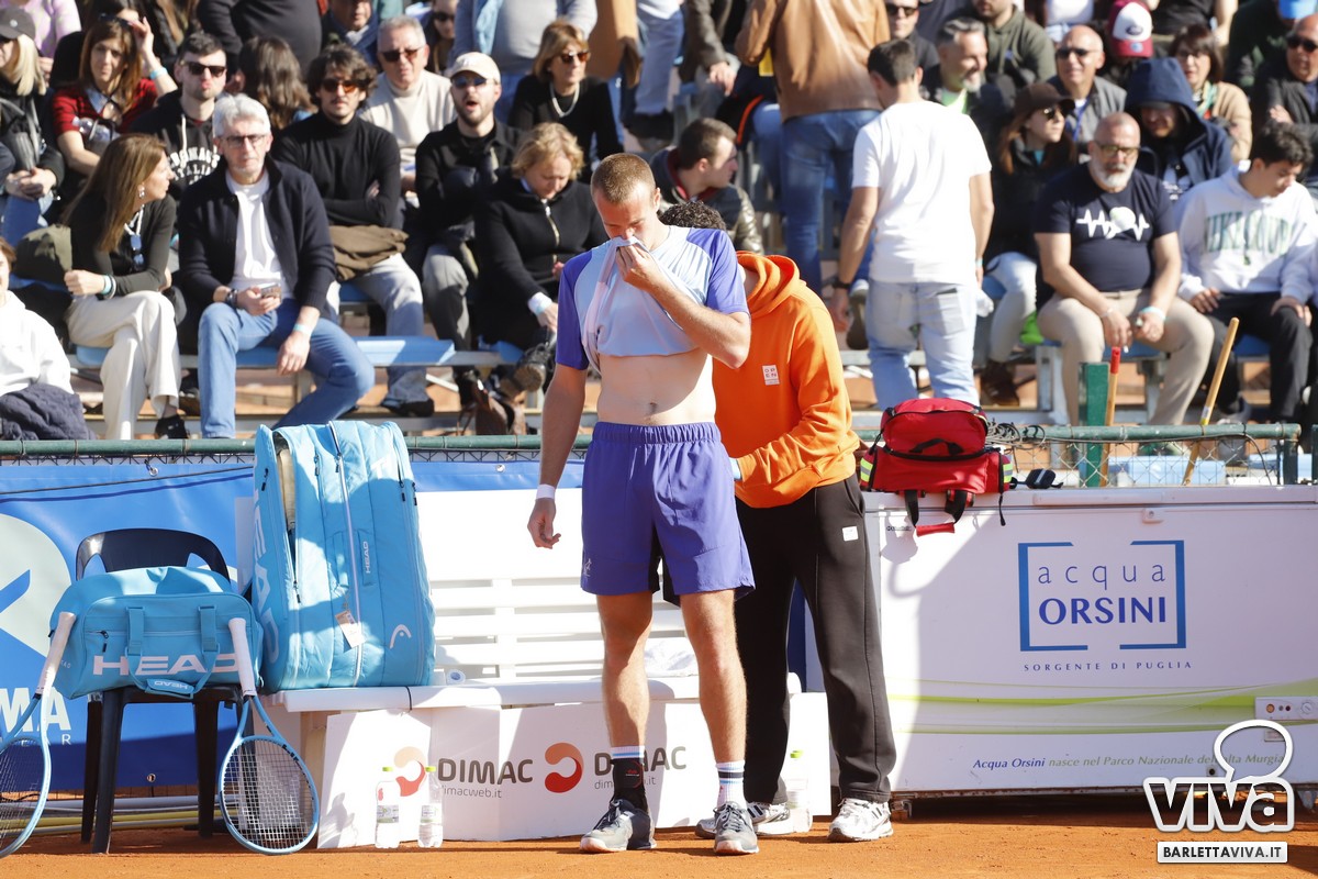Il match sembra decidersi a favore del ventitreenne di Lucca già al secondo gioco del secondo set, quando Sachko è costretto a chiamare l'intervento del fisioterapista a causa di un problema lombare.