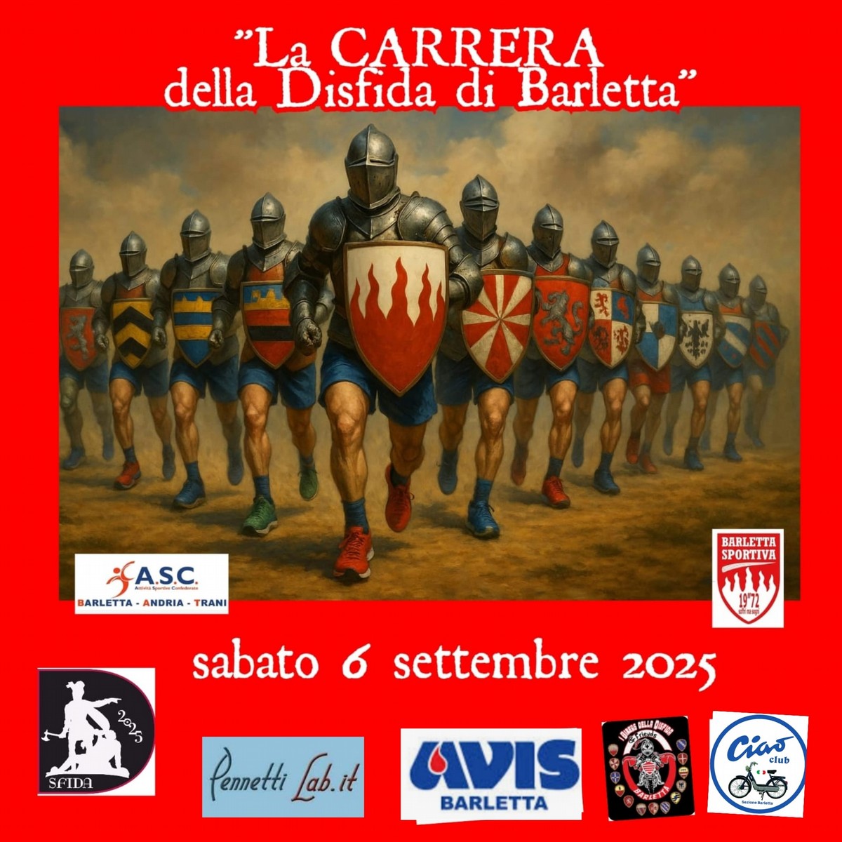 Barletta si prepara a celebrare la Disfida anche attraverso lo sport. Sabato 6 settembre 2025, a partire dalle ore 17.30, l'ASD Barletta Sportiva organizza la sesta edizione della "Carrera della Disfida di Barletta", manifestazione ludico-storico-sportiva che trasforma la memoria dei cavalieri in una corsa a staffetta per le vie del centro cittadino.