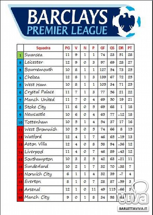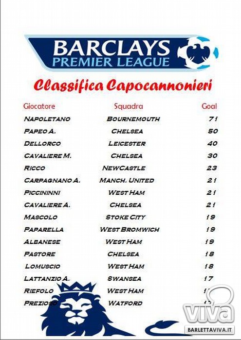 Continuano all'oratorio "Fra Dionisio" le emozioni della Premier League, un campionato che si fa sempre più avvincente ed entusiasmante. La capolista Swansea viene fermata da un ottimo Sunderland sul punteggio di 4 a 4. I "Black Cats" riescono a strappare un punticino grazie alla grande prestazione del portiere Dagostino che si esalta parando un rigore. Ad insidiare il primato dei "The Jacks" c'è il Leicester, che dopo un inizio difficile, hanno trovato la giusta inquadratura portando a 9 il bottino delle vittorie e soprattutto portandosi a meno uno dalla testa della classifica. A farne le spese questa volta è il Chelsea a cui non basta un ottimo Papeo, autore di 5 reti, per portare a casa i 3 punti. Al terzo posto troviamo oltre al Chelsea anche il Bournemouth e il West Ham entrambe con una partita da recuperare e quindi pronte ad insidiare il primato. Più defilate C. Palace e Manchester United con ormai l'unico scopo di togliersi qualche soddisfazione battendo le squadre di testa. Chiude la classifica il fanalino di coda Manchester City.