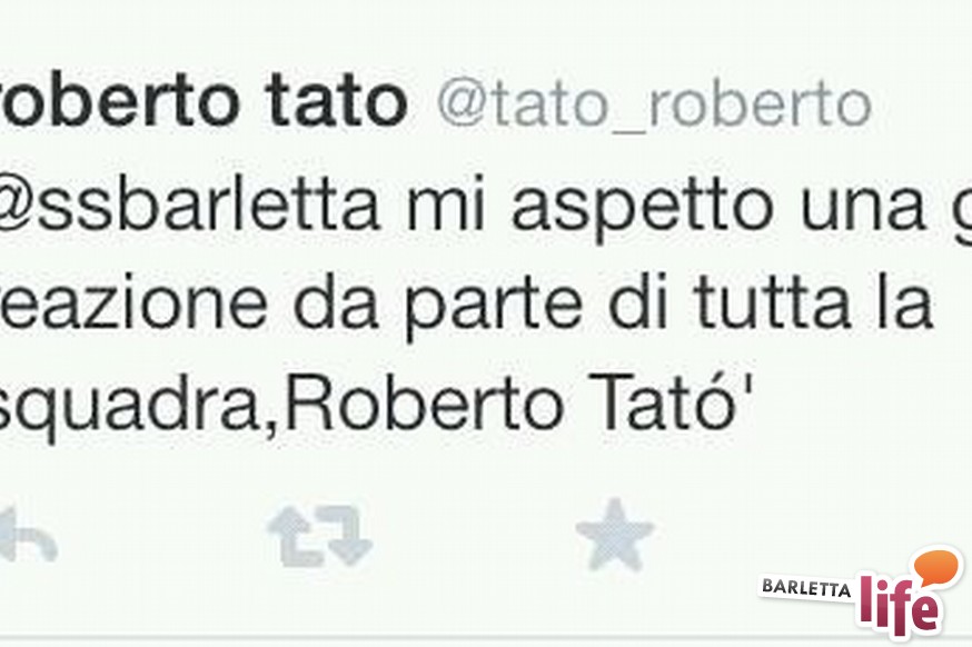 Dopo le tante parole spese in settimana per spiegare ragioni e futuro del proprio addio, il presidente del Barletta Calcio Roberto Tatò è tornato a parlare questa mattina sui social network. Questa mattina il numero uno del sodalizio di via Vittorio Veneto ha twittato alla vigilia della trasferta biancorossa sul terreno del "Vigorito" di Benevento: "mi aspetto una grande reazione da parte di tutta la squadra, Roberto Tató'" ha scritto il presidente. Un pungolìo arrivato da un mezzo "social" poco usato da Tatò, come conferma il suo profilo, che di recente aveva preferito Facebook per "parlare" in 2.0.