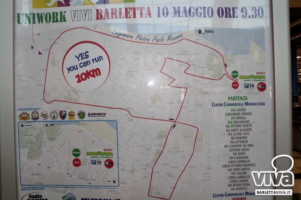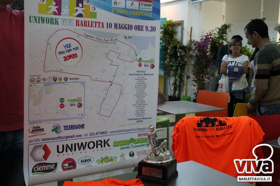 «E' un piacere poter vedere tanti amatori e professionisti accanto per le vie della città di Pietro Mennea-ha aperto le danze così Cascella-il nostro obiettivo è quello di strutturare una mattina di corsa e conoscenza della nostra splendida città. E' bello poterlo fare attraverso la collaborazione con istituzioni e enti sportivi regionali, a testimonianza dell'importanza di questa giornata: la Uniwork ViviBarletta sarà anche valida come ottava prova del campionato CorriPuglia». Alla gara potranno prendere parte gli atleti tesserati per la Fidal nel 2014, delle categorie Juniores Promesse e Seniores, in regola con la certificazione medico agonistica sportiva. La competizione si terrà con raduno a partire dalle 8 presso il centro commerciale "Mongolfiera" e la partenza sarà invece alle 9.30: le iscrizioni si potranno effettuare anche nel giorno di gara. «E' bello collaborare a questo evento-il commento di Lattanzio-il nostro contributo verterà sulla sicurezza e sulla vigilanza, appronteremo il parcheggio custodito per l'occasione».